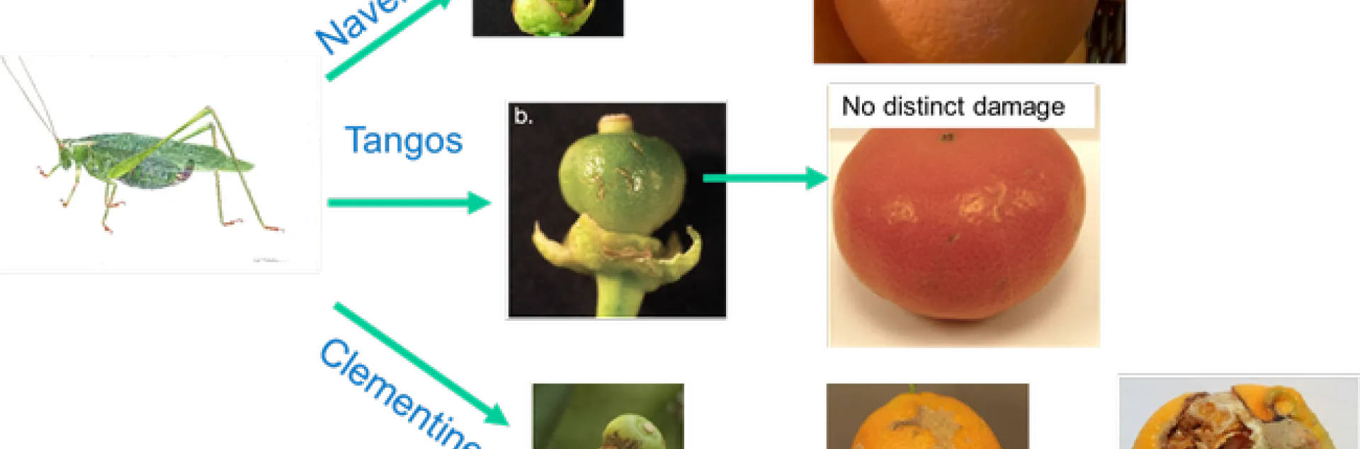 Early-season insect pests, such as katydids, earwigs, and citrus thrips feeding on newly developing fruit can cause rind scarring damage. Resulting scar damages can lead to the downgrading of fruit in packinghouses causing huge economic losses for growers. Highly valued for the fresh citrus fruit (unblemished), managing these surface-feeding pests and minimizing their damage is vital to California citrus growers. Several resources, such as “Photographic Guide to Citrus Fruit Scarring” UCANR publication 8090, published in 2003 exist to help identify various types of damages. But previous work was mainly based on work with sweet oranges.