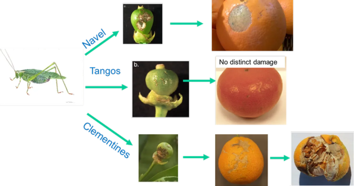 - Katydid damage on clementine looks like worm damage on sweet orange. It can cause maturing fruit to split and then drop.Figure. 1. Pictorial summary showing the different types of damages caused by katydid feeding on young and mature fruit.