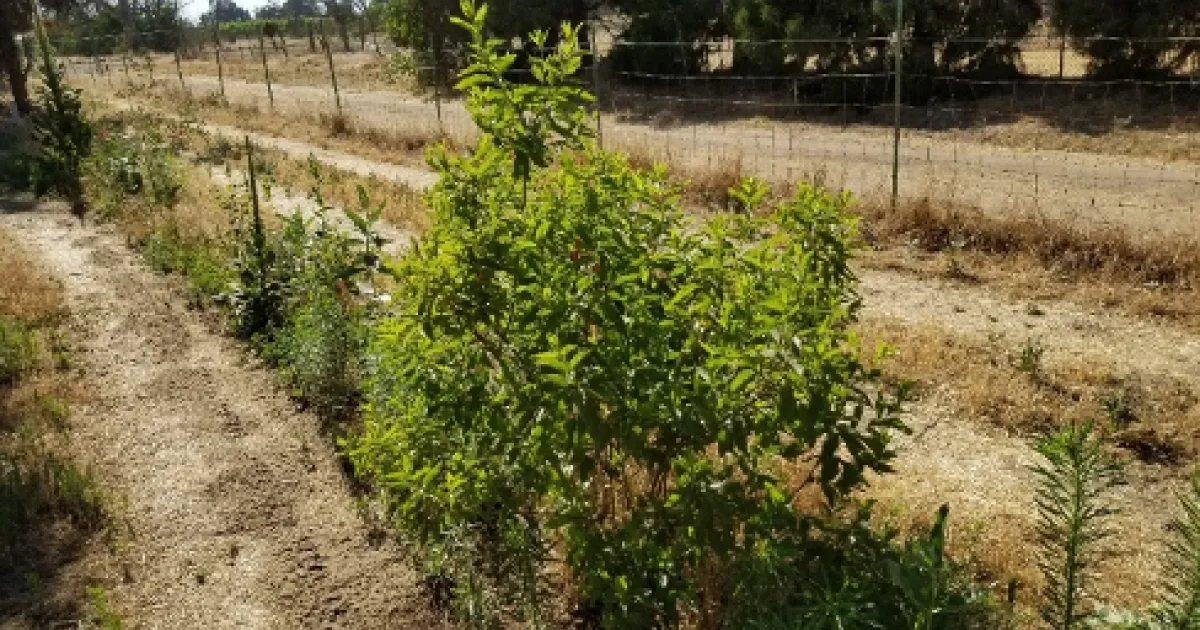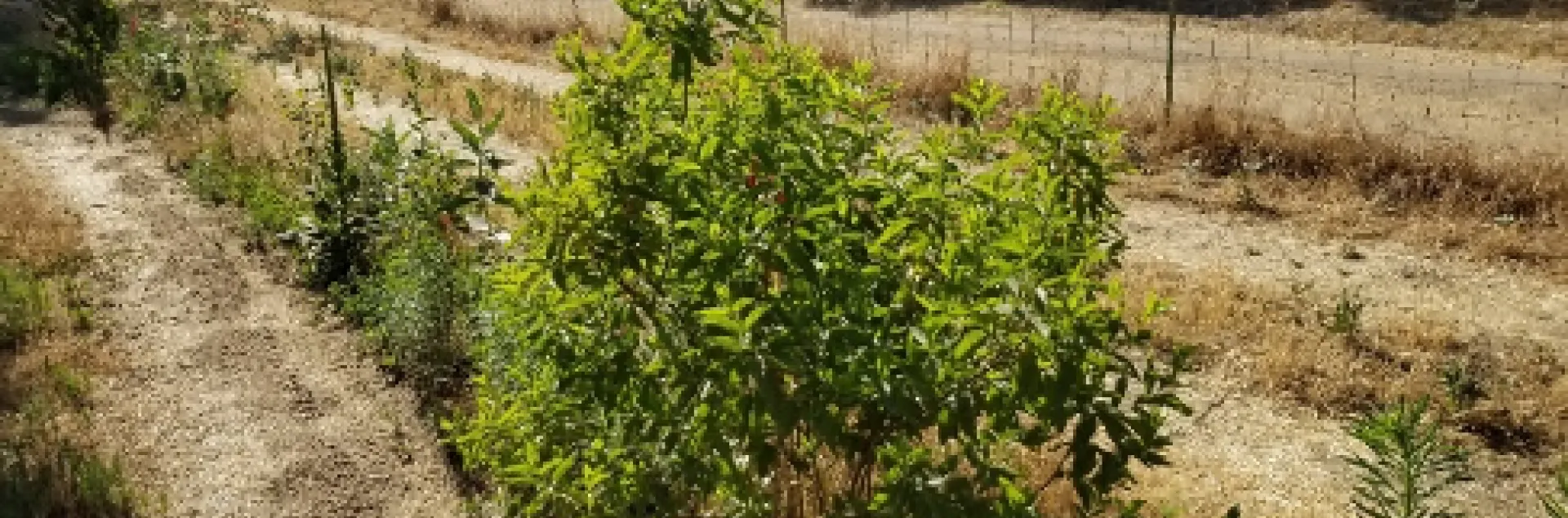 In both the trees and the vegetable crops, the mulch and compost keeps the soil moist. Steven has only watered the young fruit trees 3 times this year using furrow irrigation and has not seen any ill effects on tree health.