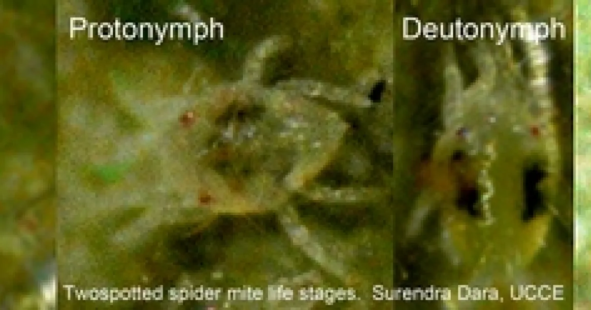 Twospotted spider mite, Tetranychus urticae Koch is a major pest of strawberries in California. Spider mite damage reduces plant vigor and contributes to yield loss. Twospotted spider mites are typically found on the lower side of the leaf and form webbing at higher population levels.