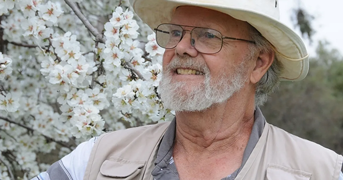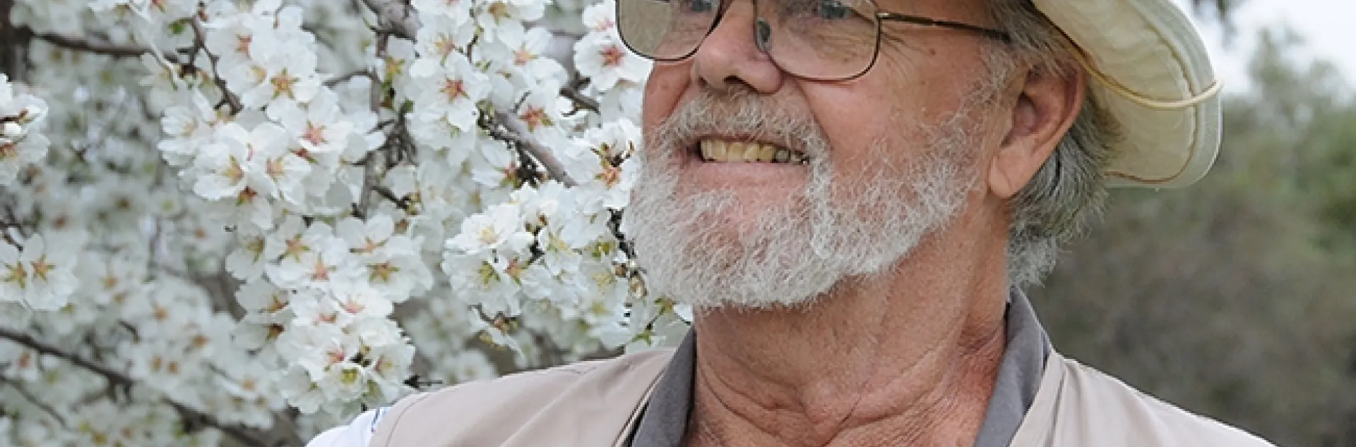 Robbin Thorp by an almond tree on Bee Biology Road, UC Davis. (Photo by Kathy Keatley Garvey)