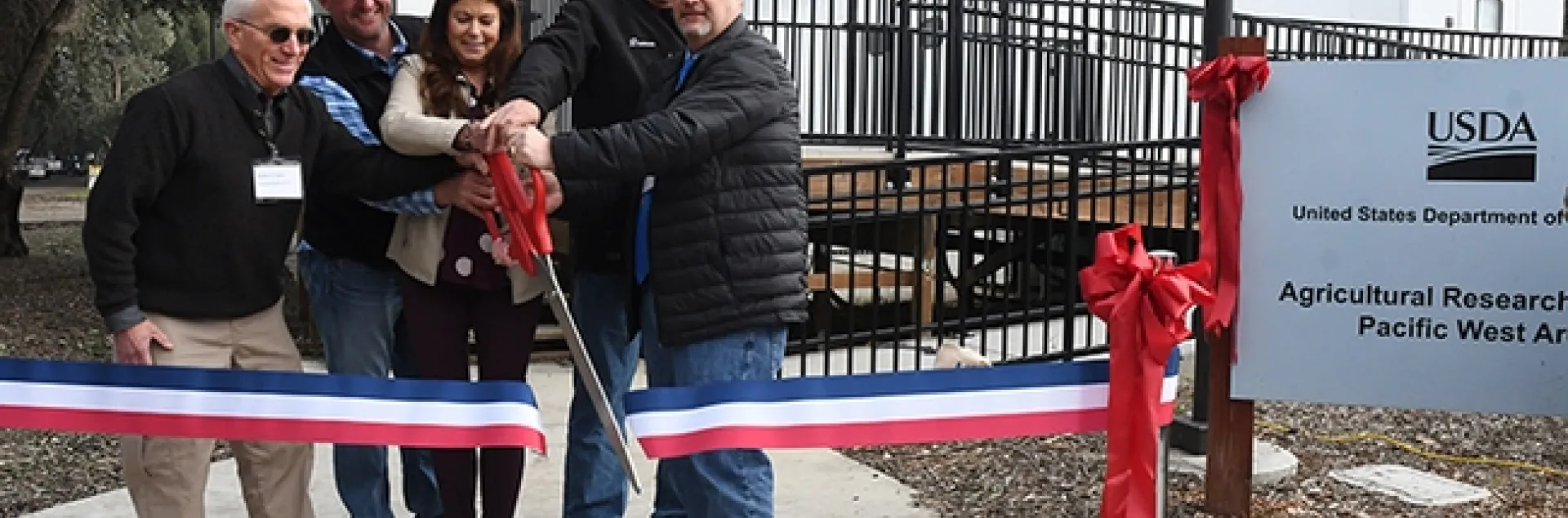 Park-Burris, of Jackie Park-Burris Queens, Palo Cedro--her family has worked with UC Davis researchers for more than 80 years--cut the ribbon with four other stakeholders: almond pollination consultant Robert Curtis of Carmichael, former director and associate director (now retired) of Agricultural Affairs, Almond Board of California; Kevin Adee of Bruce, S.D., president of the American Honey Producers' Association; Brad Pankratz of Can-Am Apiaries, Orland, Calif.; and Darren Cox of Cox Honey Farms, Logan, Utah, a past president of the American Honey Producers' Association.