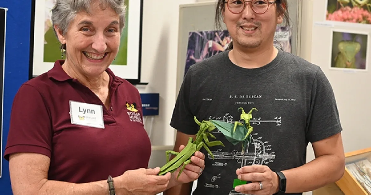 UC Davis alumnus Kevin Murakoshi of Davis arrived to gift the museum with intricate origami mantises that he crafted from "mantis-green" paper--one sheet per mantis. Murakoshi, a former UC Davis employee (computer research specialist) is the principal solutions architect at Amazon Web Services.