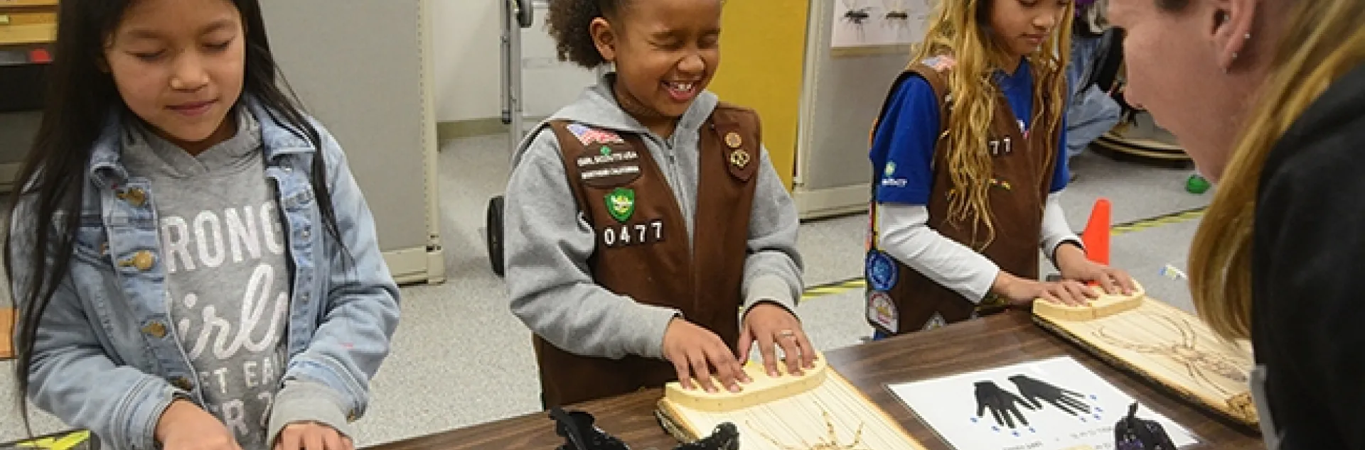 Three members of the Brownie Girl Scout Troop 30477 of Vacaville--Kendl Macklin, 7, Jayda Navarette, 8, and Keira Yu, 8--delighted in participating in all the activities. They especially liked the virtual reality station, gleefully holding onto one another for comfort as they viewed the spiders. One Brownie declined to "eat like a spider"--even though fellow participants assured her "It's just applesauce." Mikah Jarvis, 2, of Davis loved "eating like a spider." Said his parents: "He loves applesauce."