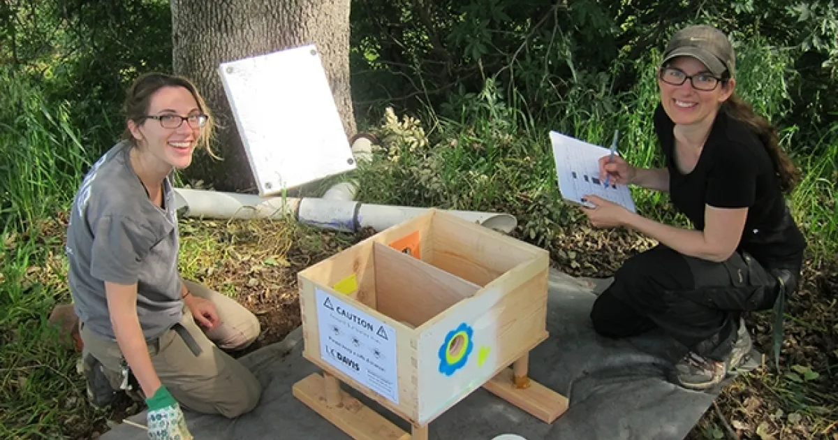 Co-lead author Clara Stuligross collects data at nest blocks for Osmia lignaria. (Photo courtesy of the Neal Williams lab)