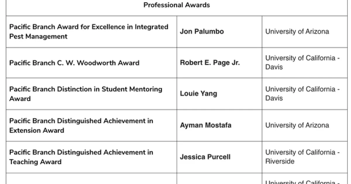 Of the 14 awards, UC Riverside scored four; UC Davis, three; Washington State University, two; University of Arizona, two; Arizona State University, one; and USDA-ARS, two.