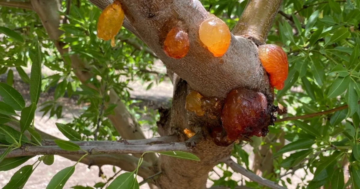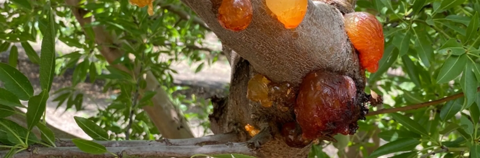 The unique coloration of the gum balls – ranging from gold and amber to dark burgundy to bright red (see photos) – generally indicates P. syringae infection. But growers are urged to contact their local Cooperative Extension advisor for confirmation.