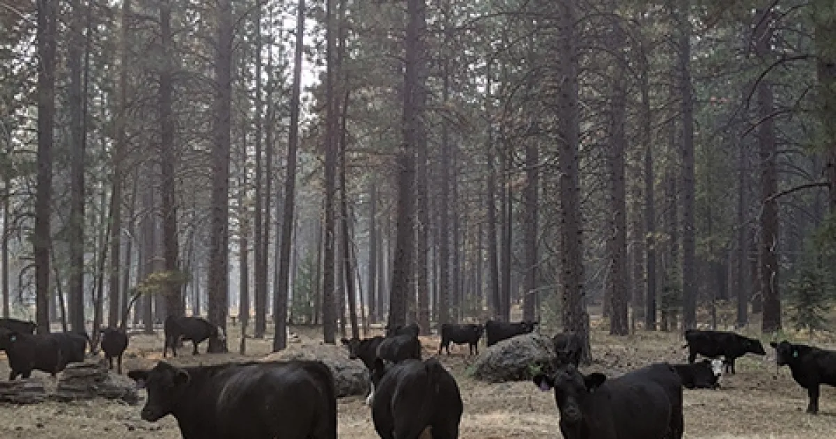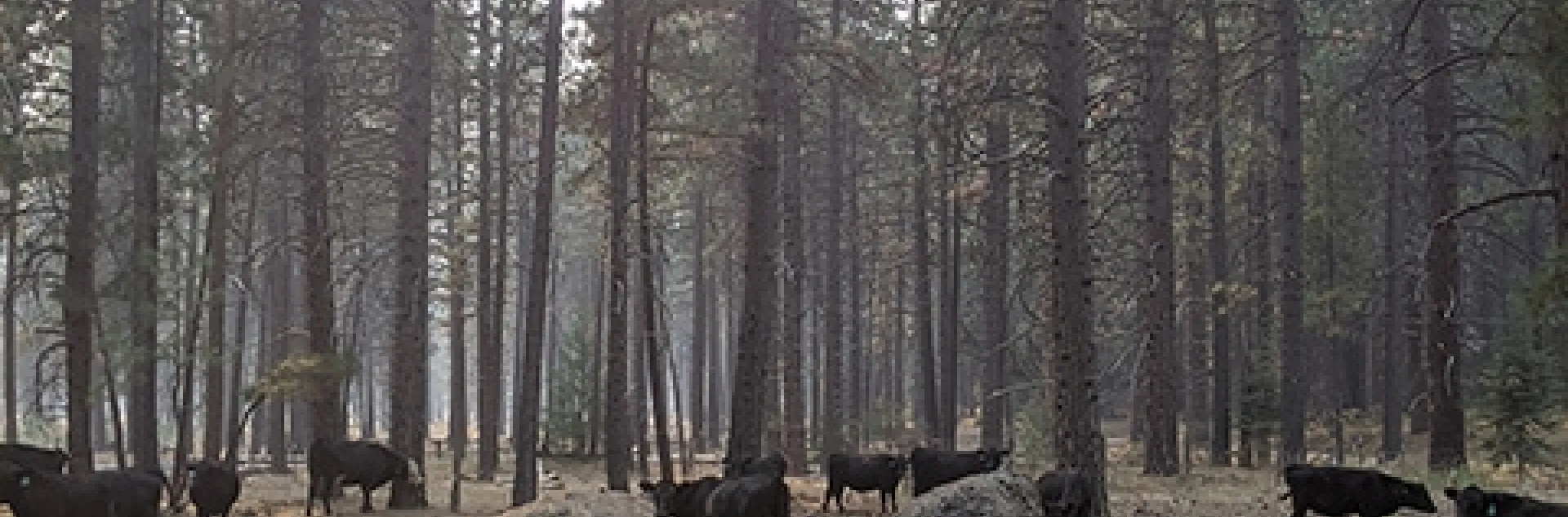 Cows gather amid trees as wildfire smoke lingers in the air above