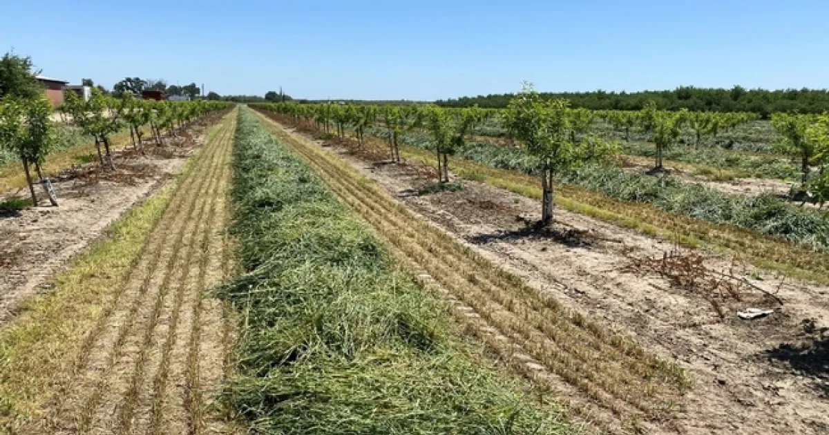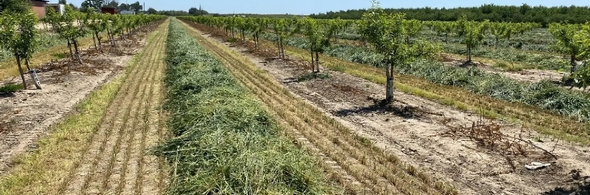 Strips of cover crop grows between rows of a young orchard.