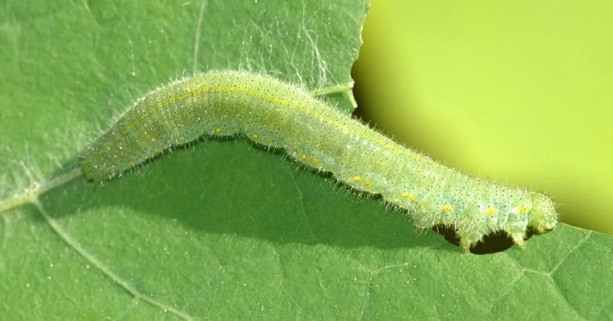 Cabbageworm larvae are green and very hairy, with a velvet-like appearance. Adults are white moths with one to four black spots on their wings. They lay eggs individually on the leaves of brassica plants and, after hatching, the caterpillars eat the leaves and cabbage heads.