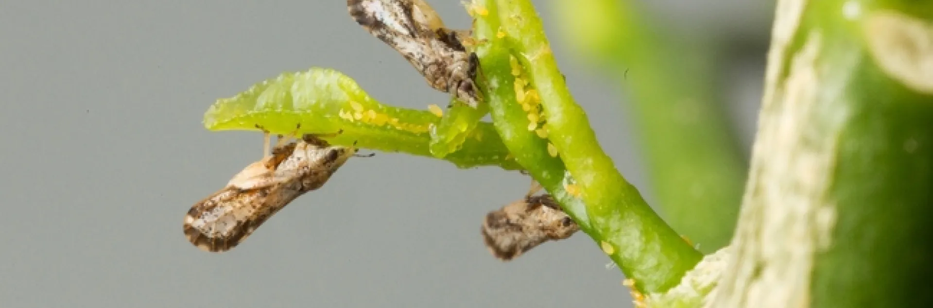Using a hand lens or loop, look closely at the leaves and tender new growth. The ACP adult is the size of an aphid and feeds with its rear end tilted up at a 45-degree angle. Nymphs produce white, waxy tubules and are always found on new leaf growth or young stems. The eggs are yellow-gold and found on the newest leaf growth, nestled among unfolded leaves.
