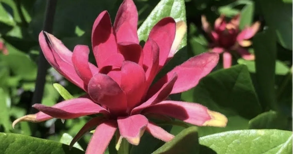 Large leathery leaves have a spicy scent when crushed and turn golden yellow in the fall. Fragrant maroon red flowers, reminiscent of lotus flowers, magnolia blossoms or water lilies, appear in late spring through summer. The distinctive flowers are actually whorls of structures called tepals, or undifferentiated petals and sepals.