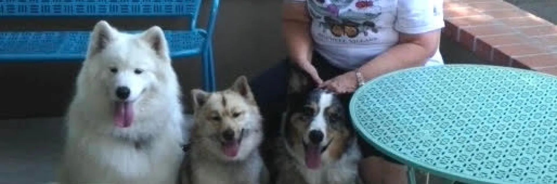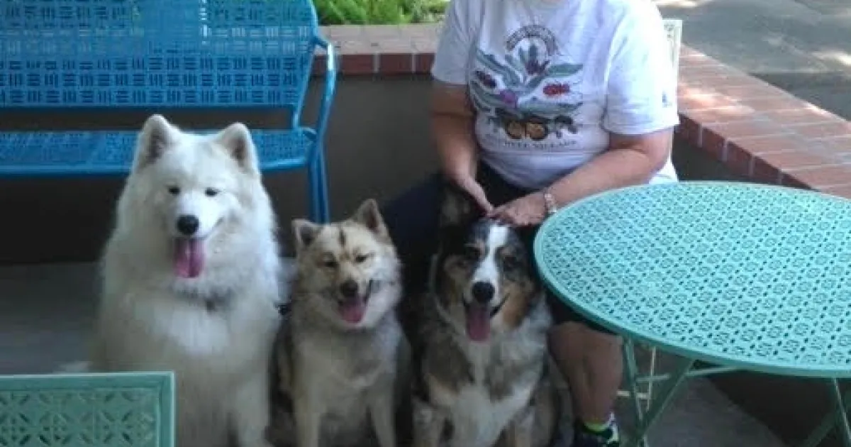 Karen Basso takes a break at a coffee shop while out walking her late dog Lexi, left, and friends' dogs. (Photos: Karen Basso)