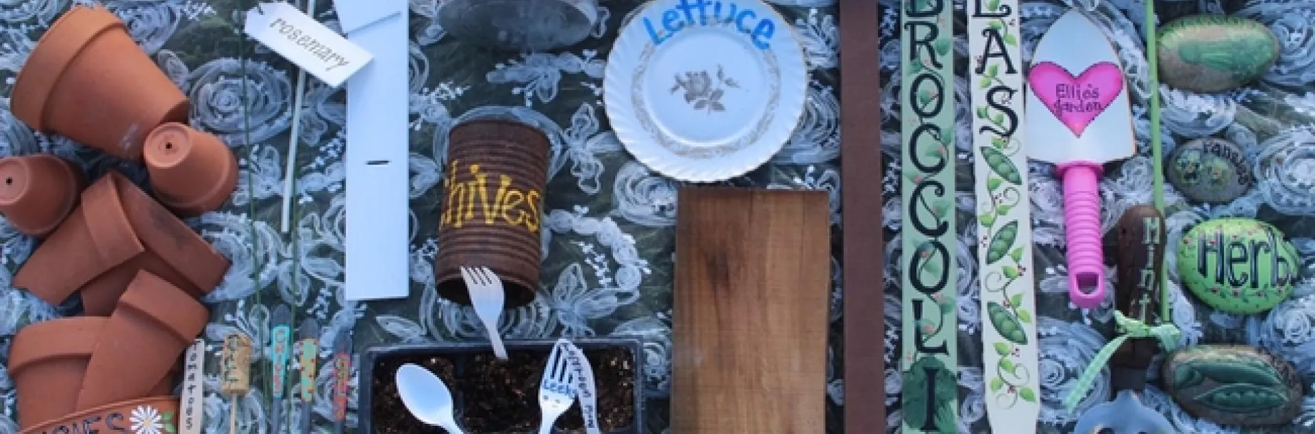 For a vintage-style garden, look for an old metal watering can. Again, name your garden, “Grandma's Garden” if you wish. Add markers such as vintage metal cans, vintage silverware, or any vintage find that can hold a name.