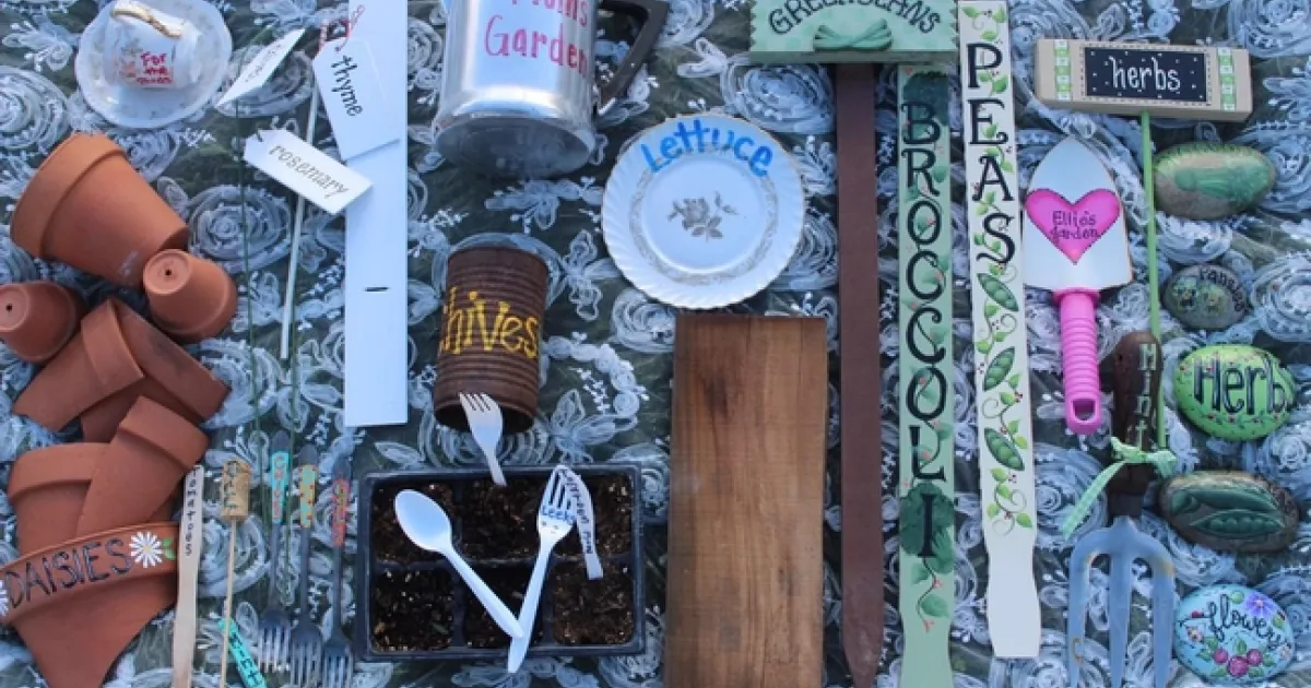 Here are some supplies you may need to help you create plant labels: paint and brushes, permanent markers, glue, nails, screws, twine, wire, metal sticks, and any tools you will need. Also, UV varnish is recommended to spray or brush over the painted designs and lettering to help preserve them.