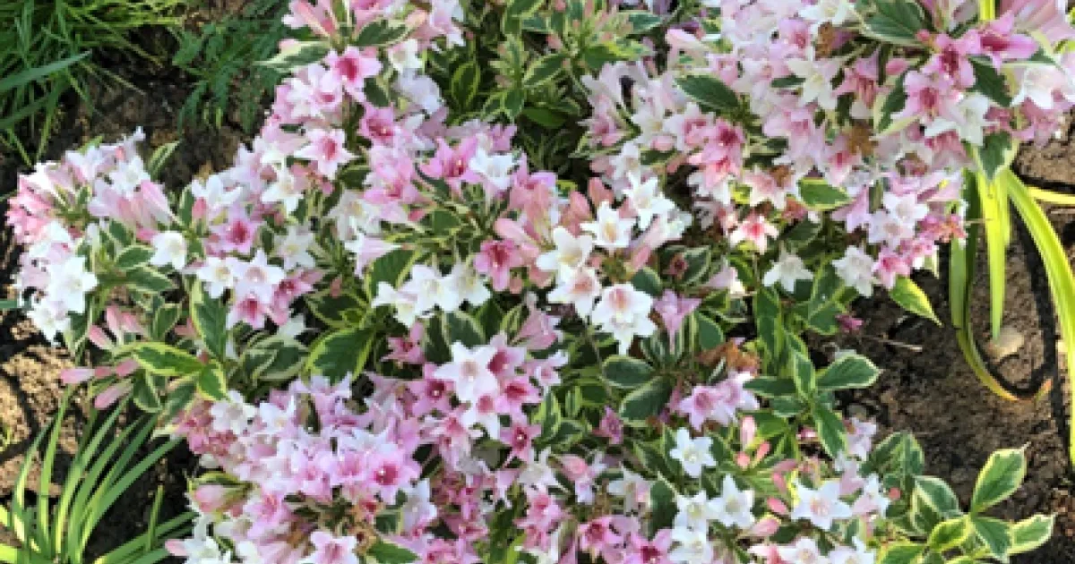 PERENNIAL SHRUB: Weigela is a shrub from Asia whose name is pronounced “why-gee-la.”Weigela comes in three colors: white, pink, and red. However, as the blooms of the white version age, they fade to pink, creating a layered multi-color show, as seen in the photo below of one I planted a few years ago.Weigela is deer resistant and attracts butterflies. Its arching, loose growth habit looks good in almost any garden. It is tolerant of shade.Weigela is an upright plant that can grow to 4 feet tall and 4 feet wide. Bloom time is in spring here. Mine was done blooming before May 1. However, plant breeders have been busy creating long-blooming Weigela such as Sonic Bloom®, which blooms heavily in the spring and continues to bloom from summer though the fall. It is a very dense shrub, approximately 5 feet high and 5 feet wide, with brilliant rosy pink blooms amid the dark green foliage.