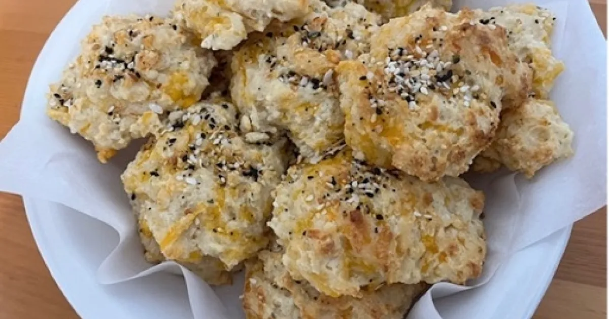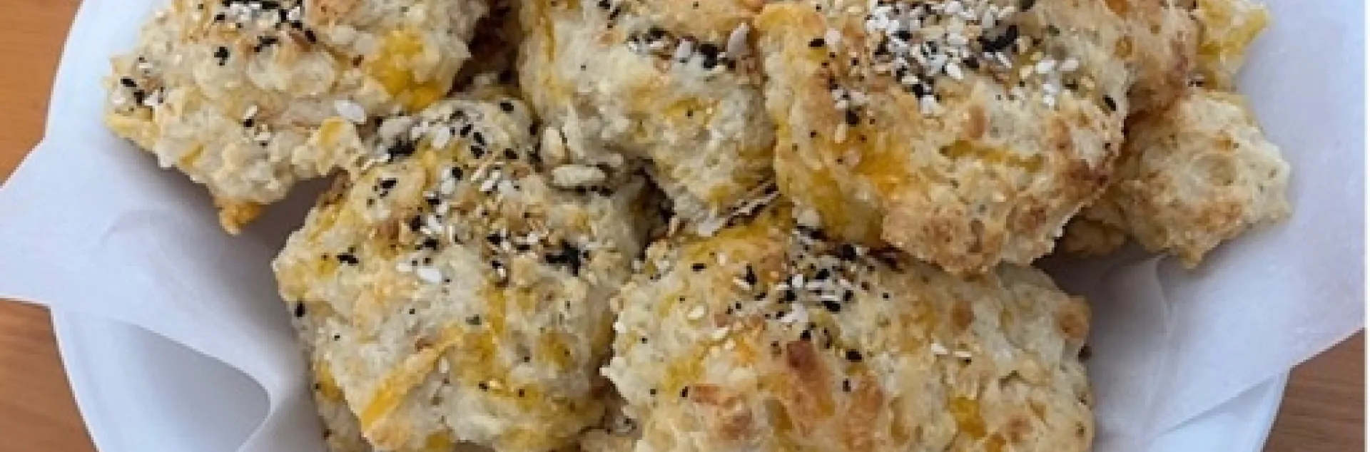In a large bowl, combine the baking mix, cheese, garlic powder and salad dressing mix. Stir in buttermilk just until moistened. Drop by tablespoonfuls onto greased baking sheets or parchment lined sheets. Bake at 375? until golden brown, 6-8 minutes. Meanwhile, combine topping ingredients. Brush over biscuits when removed from oven. Sprinkle with Everything but the Bagel. Serve warm.