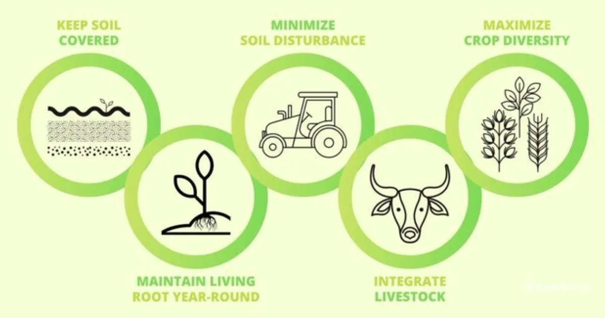We often think carbon is something dangerous because we associate it with climate change. However, it is the building block for all life. In the atmosphere as carbon dioxide, carbon produces a greenhouse effect that heats the planet, but plants use carbon to create cells to grow and feed microorganisms in the soil that supports them. Therefore, the principles of regenerative agriculture aim to reverse these adverse effects by following rigorous guidelines, which include using cover crops, reducing tilling, rotating yields, spreading compost, and moving away from synthetic fertilizers, pesticides, herbicides, and factory farming.