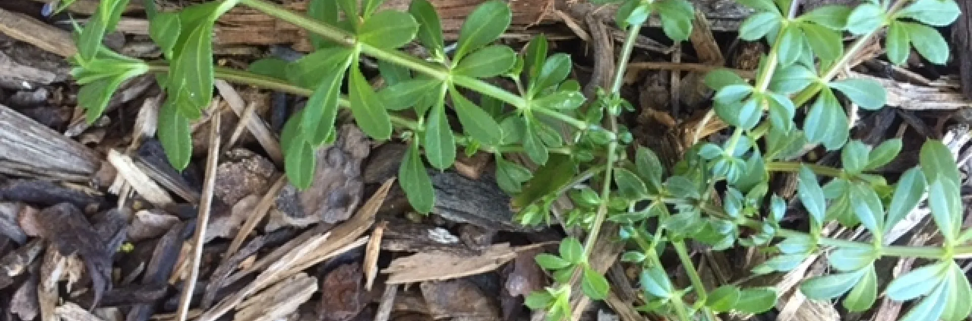 Catchweed bedstraw is a summer annual broadleaf plant that is starting to show in your gardens now! Its bristles attach to people's clothing and the hair of animals, aiding in its dispersal. If you have this plant, get rid of it now. It is very distinctive with a square stem and sticky feeling.