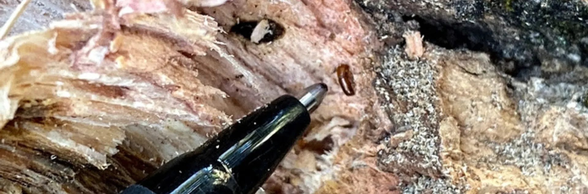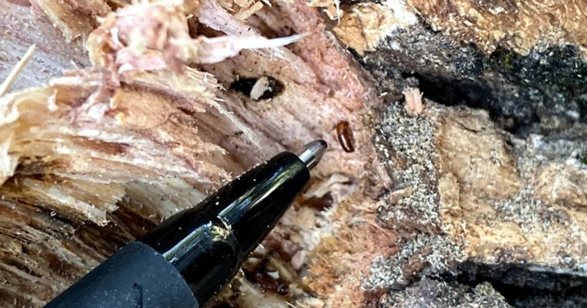 A ball point pen points to a Mediterranean Oak Borer, indicating its tiny size.