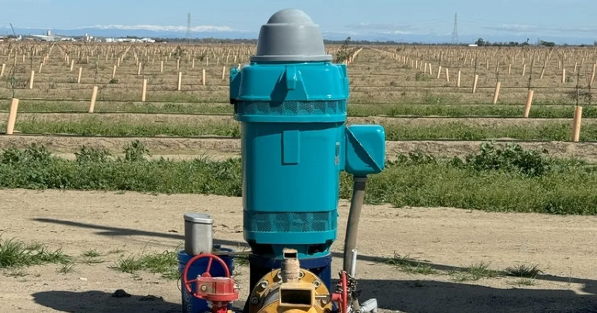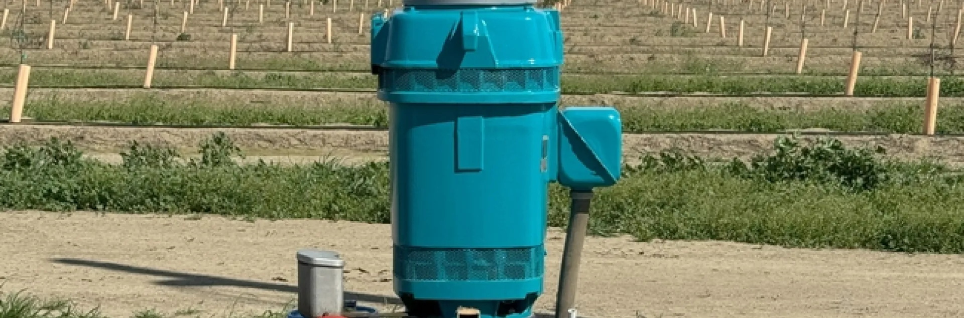 A blue and yellow well pump is shown at the edge of a field of saplings.