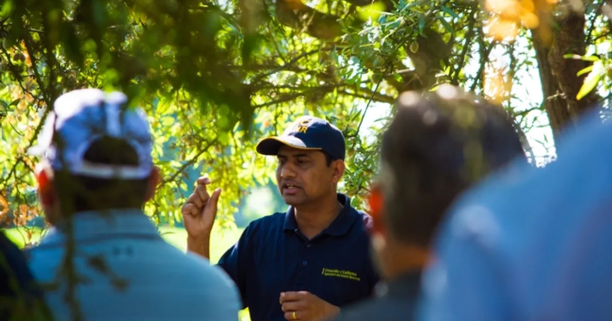 Rijal hosted a gathering of farmers and pest control advisers Aug. 13, 2019, in the Turlock almond orchard to give them a first-hand view of the pest and the problems it causes.