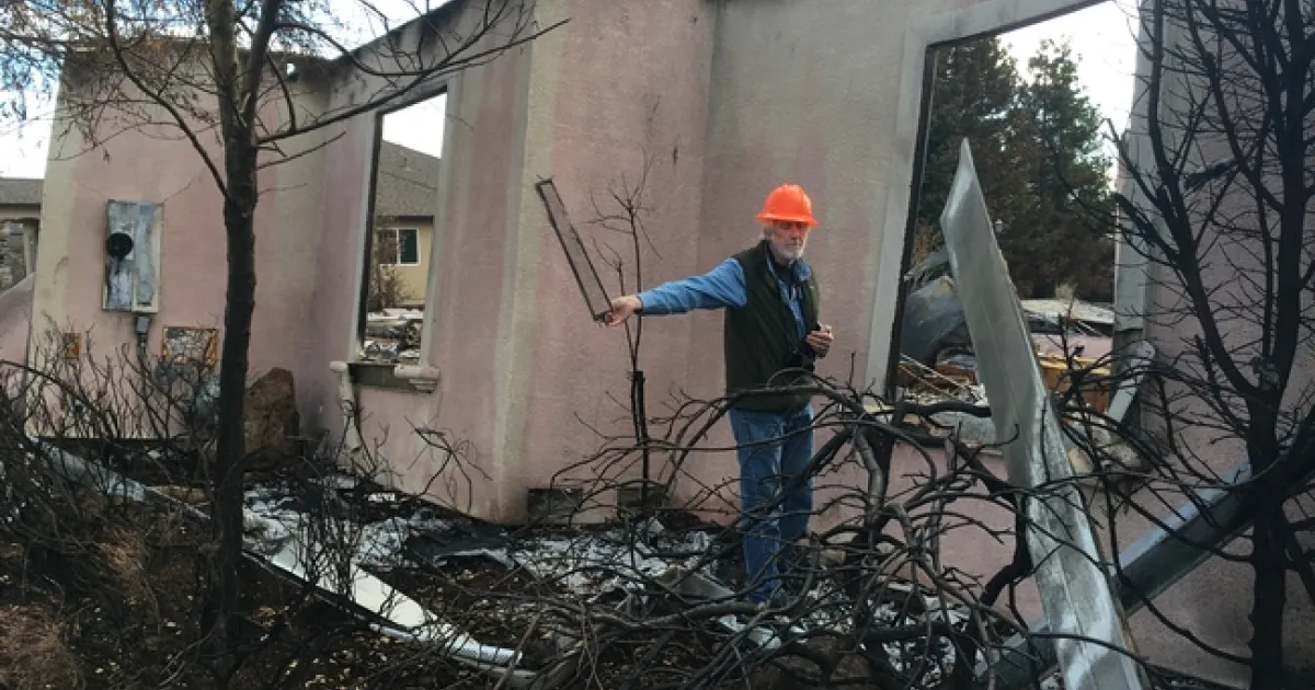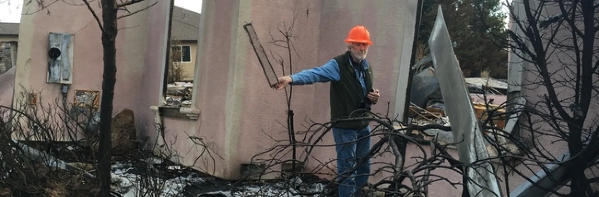 Steve Quarles and Yana Valachovic examined houses in Paradise after the devastating 2018 Camp Fire. Quarles holds up a vent screen that may have allowed embers to enter the house. Photo by Yana Valachovic