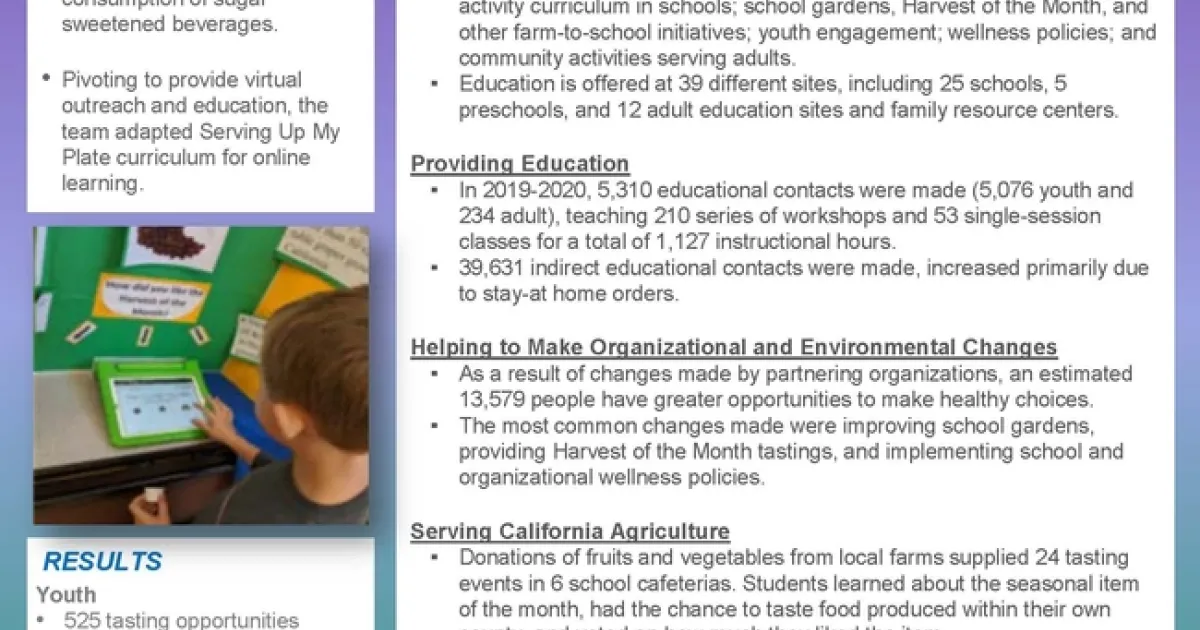 Across the Central Sierra in federal fiscal year 2020, the program made 5,310 educational contacts (5,076 youth and 234 adult), teaching 210 series of workshops and 53 single-session classes for a total of 1,127 instructional hours. An additional 39,631 indirect education contacts were also made, with a focus on promoting fruits and vegetables and normalizing healthy living during the first half of the year, and shifting to food access and physical activity during the second half of the year. Also, by working with 34 organizations to implement 110 changes to their policies, systems, and physical environments, an estimated 13,579 people have greater opportunities to make healthy choices in their lives. These activities were delivered and supported by 13 dedicated professionals (10.6 FTE funded) and many volunteers who implemented dozens of different educational strategies and curriculum to improve the health of the most vulnerable Central Sierra residents.
