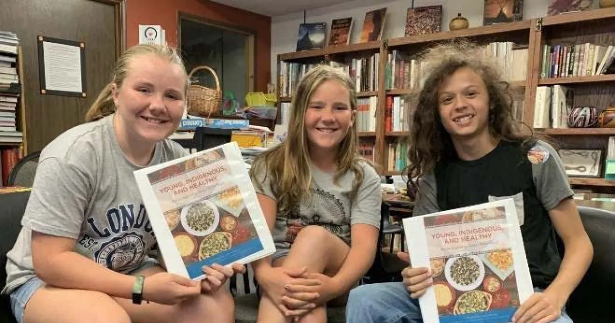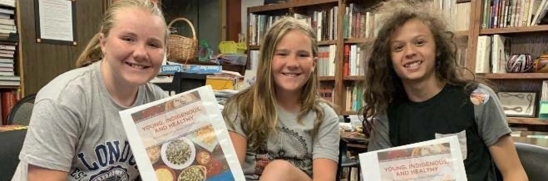 Young people at Foothill Indian Education Alliance facility pose with a cookbook of Native recipes