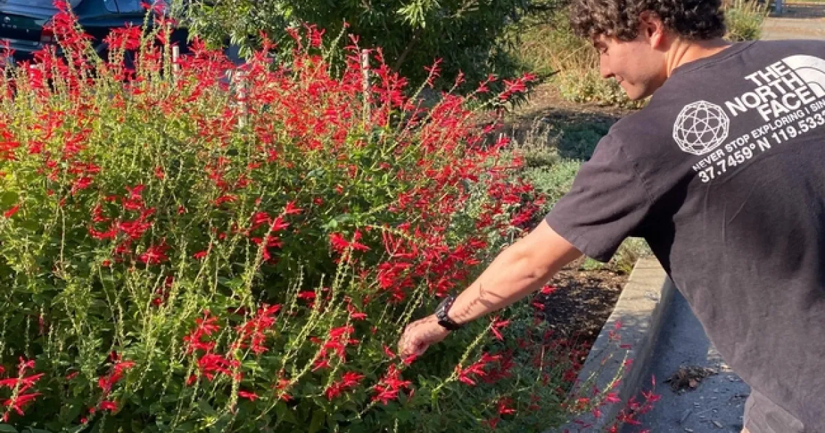 Assistant Researcher Jerid Vega with Pineapple Sage (Salvia elegans) at the Urban Bee Lab Garden in Berkeley, CA