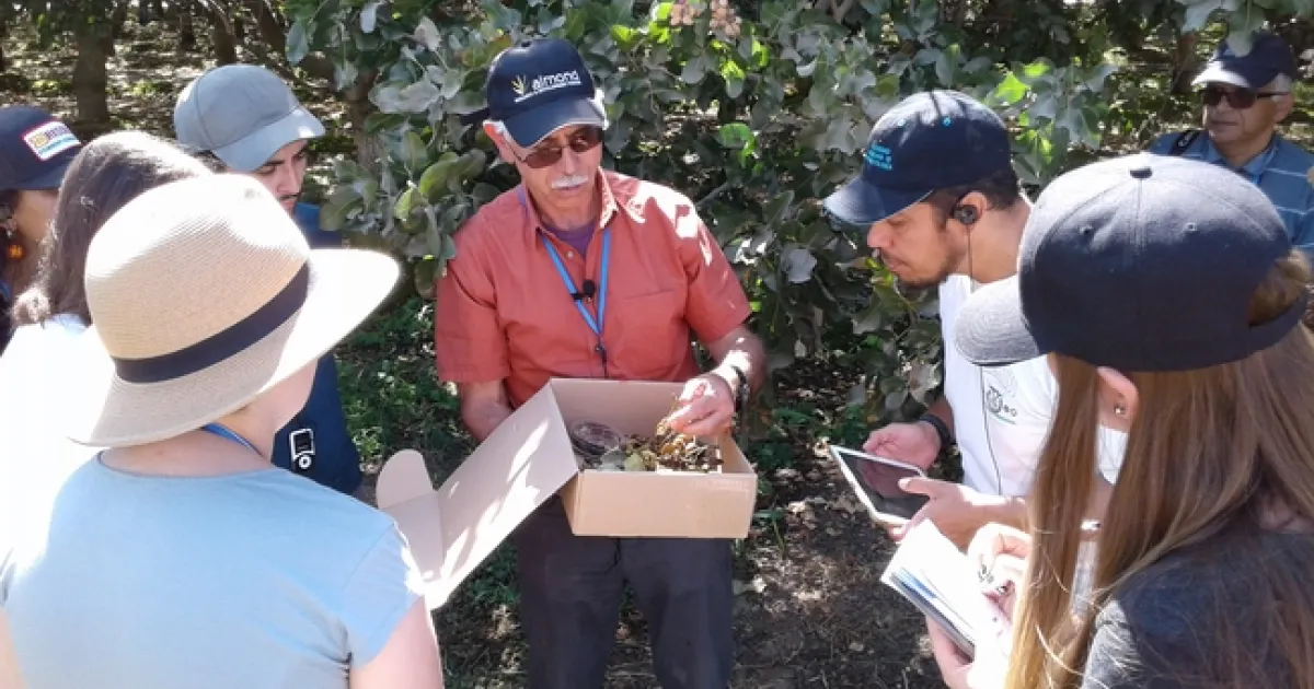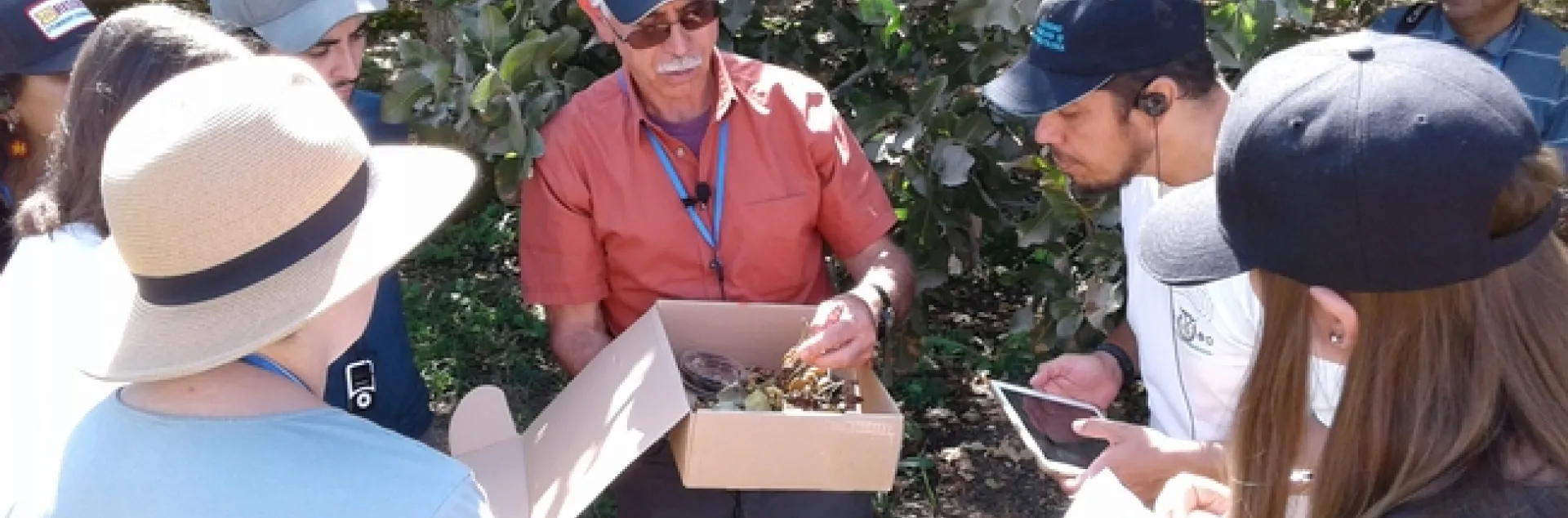 Themis Michailides, Plant Pathologist, showed the students samples of infected pistachios. Later he said of this, “The disease is anthracnose of pistachio caused by Colletotrichum fioriniae, according to Project Scientist, Paulo Lichtemberg. It is a new disease in California and caused major problem in a few orchards in Glenn Co. The same disease in 2010 destroyed 75% of the Australian pistachio crop.  It is fortunate that the Kerman pistachio that is extensively planted in California shows more tolerance to this pathogen than the susceptible Red Aleppo cultivar. At present, we (with the lead of Paulo Lichtemberg) are doing epidemiological studies to determine conditions affecting the disease, evaluation of pistachio cultivar susceptibility to the pathogen, and fungicide trials to manage it.” Below.