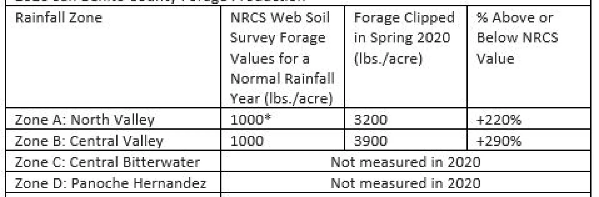Forage production was clipped on May 8, 2020. Average annual rainfall (from 1994-2017) for San Benito County according to CIMIS Weather Station #126 in Hollister, was 14.42 inches. CIMIS reported 10.9 inches for this station from October 2019 – May 2020. According to the San Benito County RAWS weather station at Pinnacles National Park, average annual rainfall (from 2001-2017) was 9.83 inches. The Pinnacles RAWS station reported 11.79 inches for from October 2019 – May 2020. Rainfall was lower than average this year in the northern part of the county, but higher than average in the central part of the county. The rainfall started slow this year with no rainfall in October. It rained some in November and picked up in December, but declined again in January. In February as with October, there was no rainfall. March picked up again, with less in April and almost no precipitation in May.