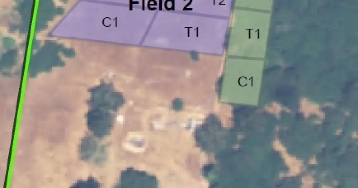 Property 1 is a 17-acre farm that runs sheep, pigs, and chickens. There are eighteen plots across three fields on this ranch (Figure 1), half of which received the compost treatment (labeled as T1, T2, and T3) and half of which were control plots (labeled as C1, C2, and C3), not receiving the compost treatment. Field 1 is grassland and was broadcast seeded with an LA Herne dryland pasture mix in January 2020. Field 2 is an unseeded open grassland, and Field 3 is an oak woodland. Table 1 lists acreage for each plot. Compost was spread across a total of 1.29 acres at Property 1.