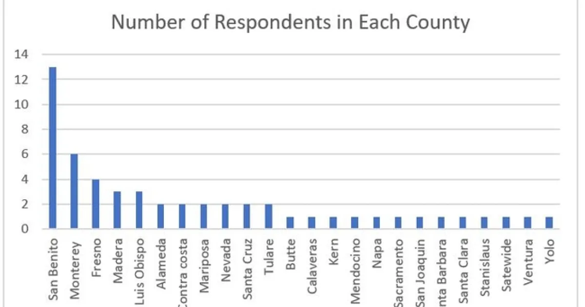 Between 9/14/2018 and 9/27/2019, 49 people filled out the survey. The vast majority of surveys were filled out in 2018. Question 1 was, “What county are you based in?” Some people identified more than one county. Therefore, when added up there appear to be more than 49 responses. Forty percent (24) of California's 58 counties were represented in the survey. Most responses were from San Benito County (Figure 1). In addition, more than two responses were received from Monterey, Fresno, Madera, and San Luis Obispo counties.