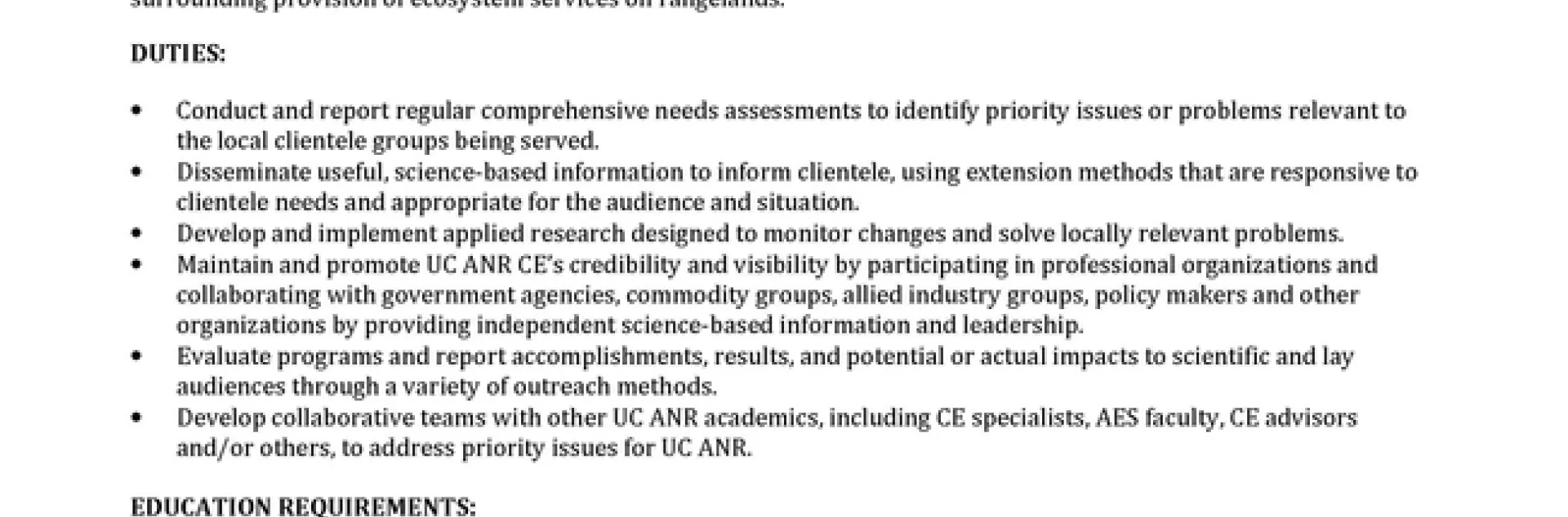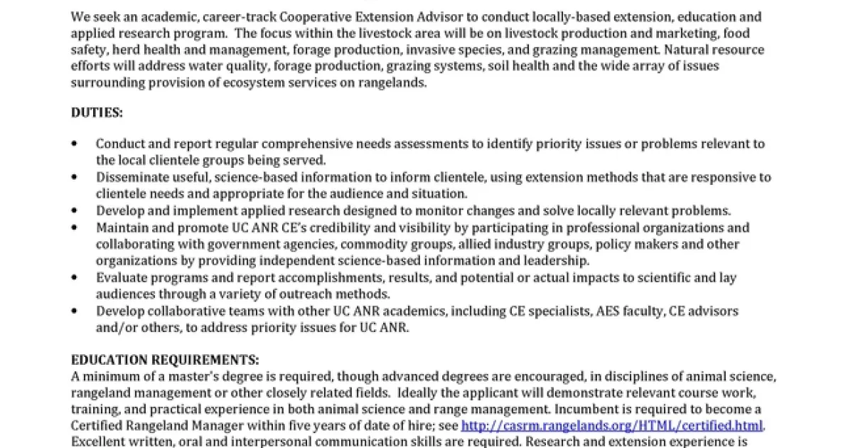 The University of California Cooperative Extension (UCCE) is recruiting to fill a Livestock and Natural Resources Advisor position for Fresno and Madera counties. Applications are due Sunday, June 12, 2016.