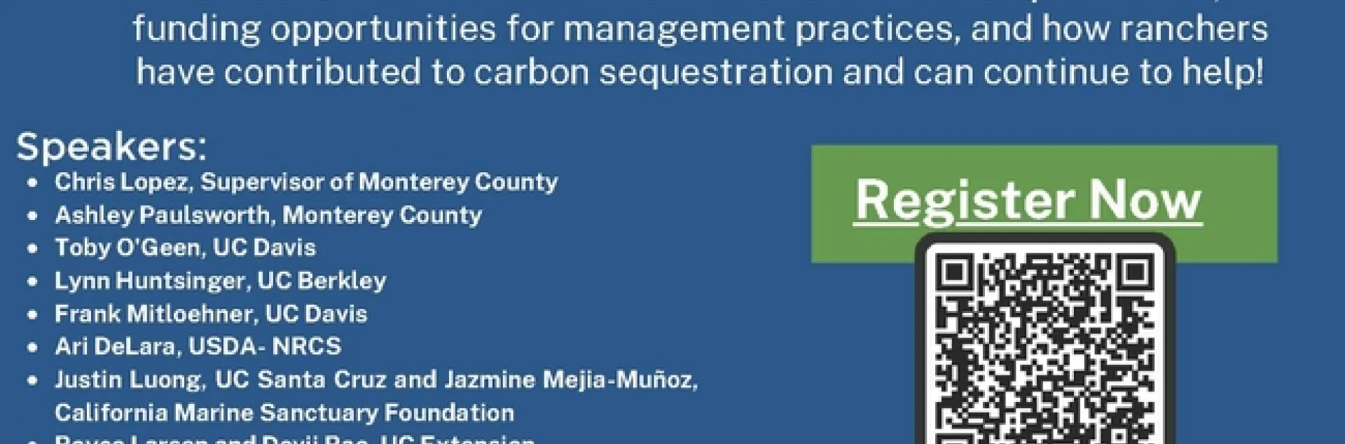 I just wanted to remind everyone to please register for the workshop titled Monterey County Rangeland Carbon Sequestration: Ranchers and Rangelands Are Part of the Climate Change Solution. This is a great opportunity to learn about the latest science, share your thoughts, and help inform Monterey County's Climate Action Plan.