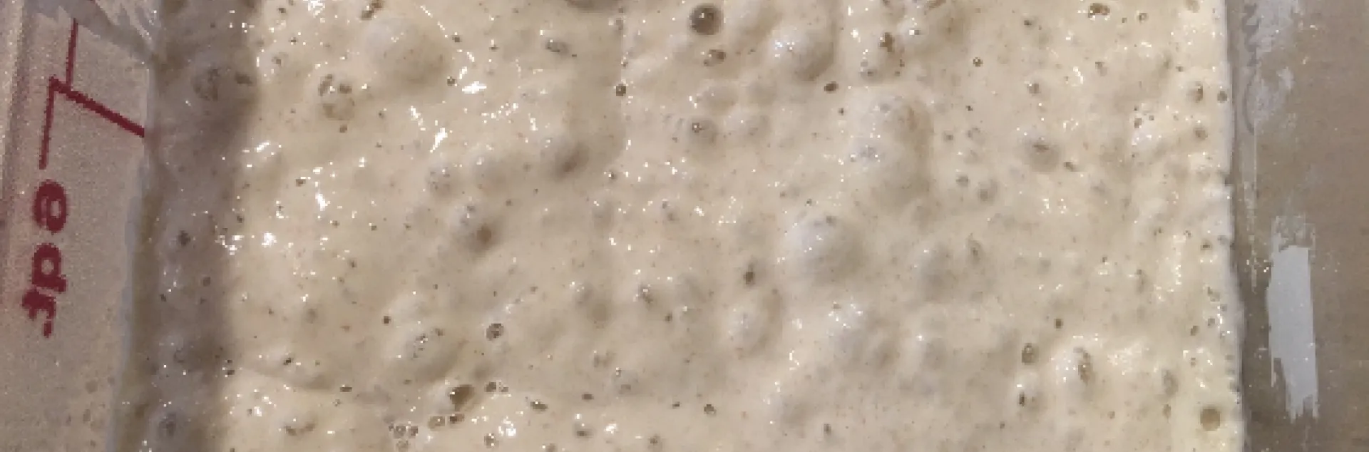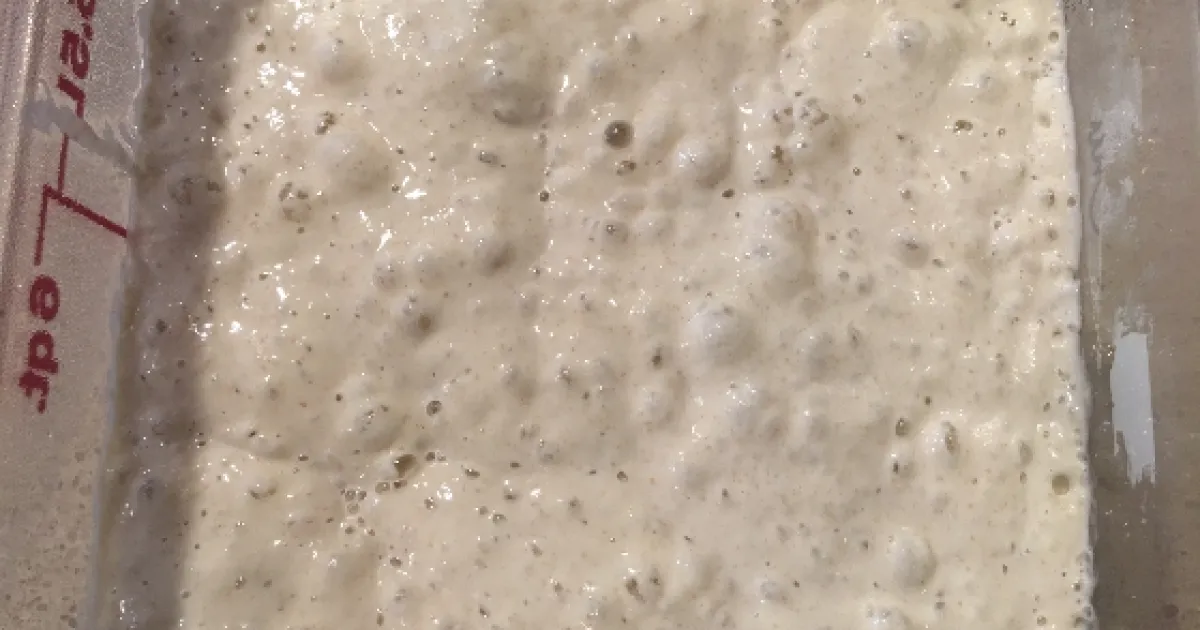 Place in a food grade container and mix well. Scrape down the sides of the container to prevent areas of drying. Cover loosely and let sit for about 12 hours at room temperature. The lower the temperature, the slower it will ferment and tangier your bread will be. An ideal temperature is around 72°F.