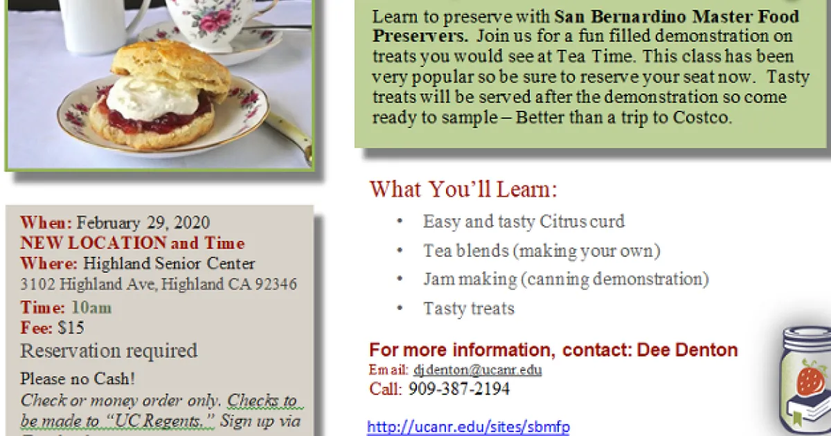 February 6, 2020 Print San BernardinoStart your spring off tastily--Attend the Tea, Treats and Jam Making Class.It's at the end of this month, February 28, so it is coming up FAST. Be there, watch some jam making, enjoy some cooking demo treats!