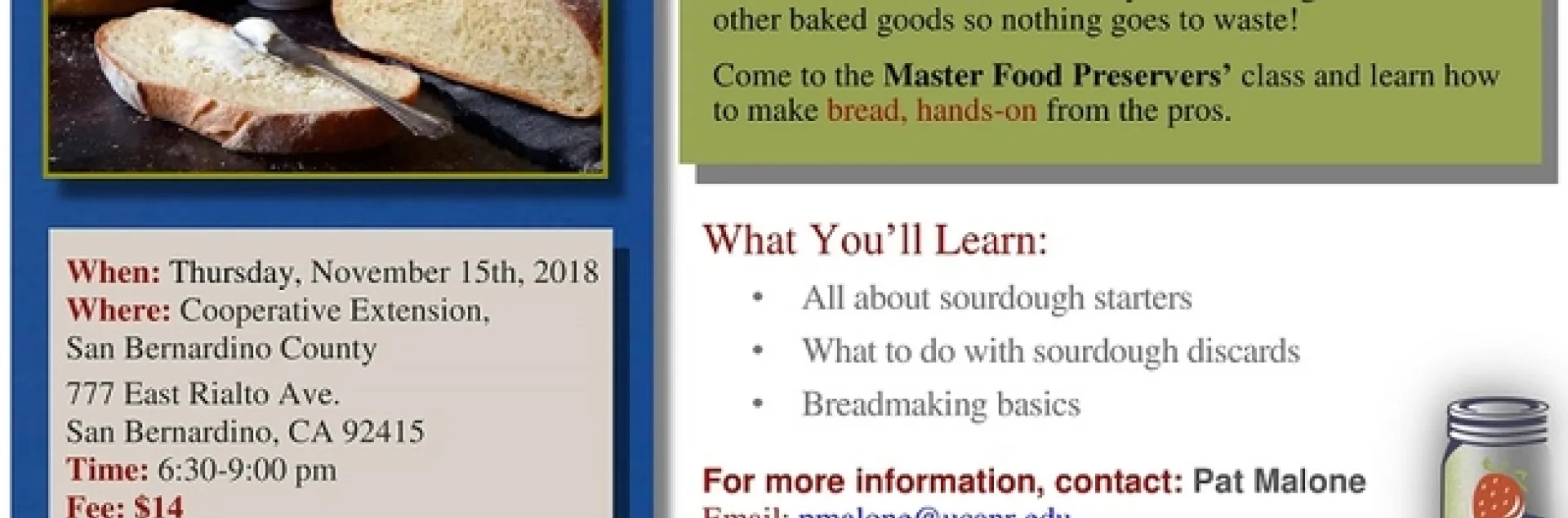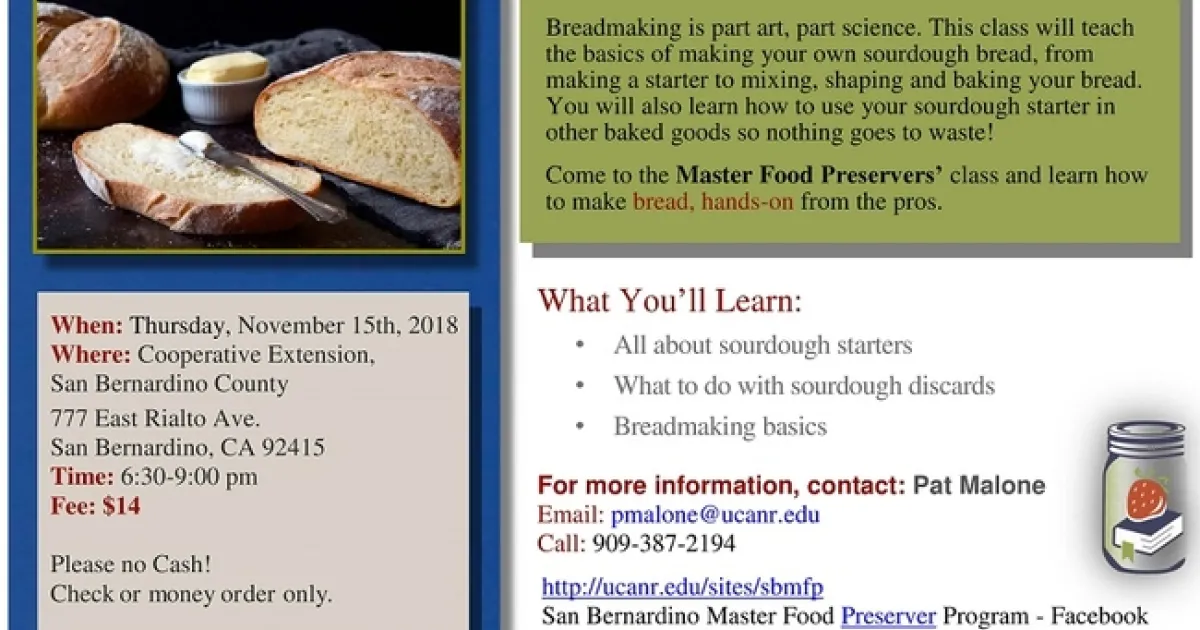 October 11, 2018 Print San BernardinoNext month, learn to bake sourdough bread! Work hands-on with the dough--for not very much dough! A great class is coming up quickly so sign up today!