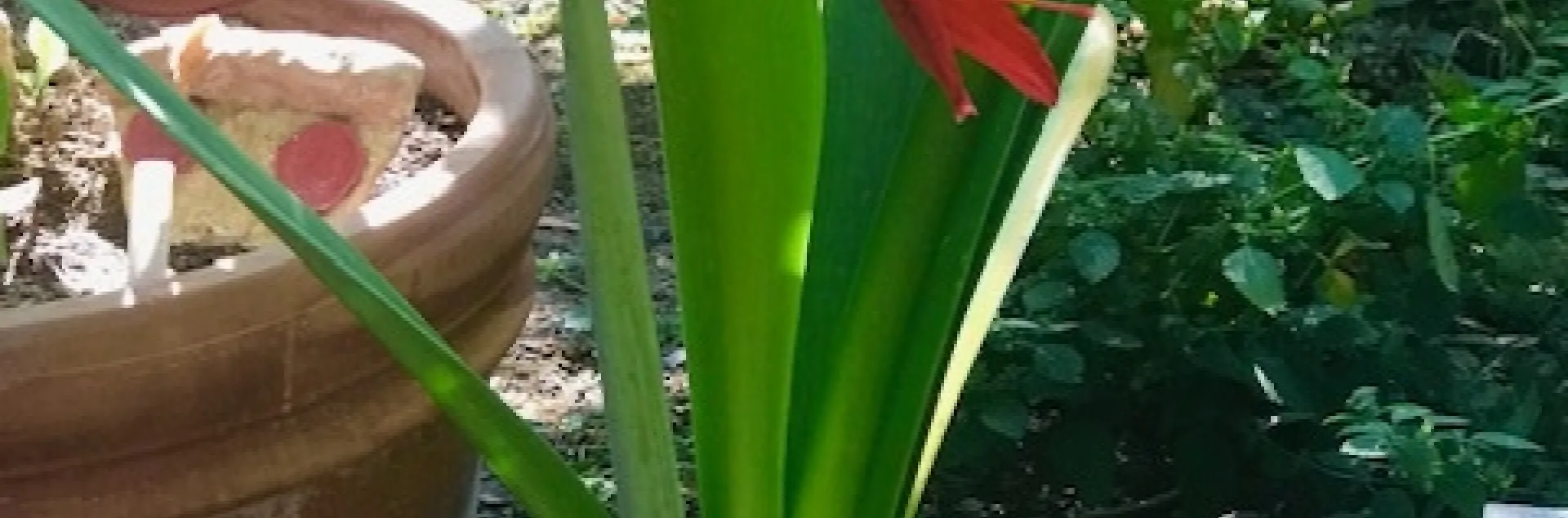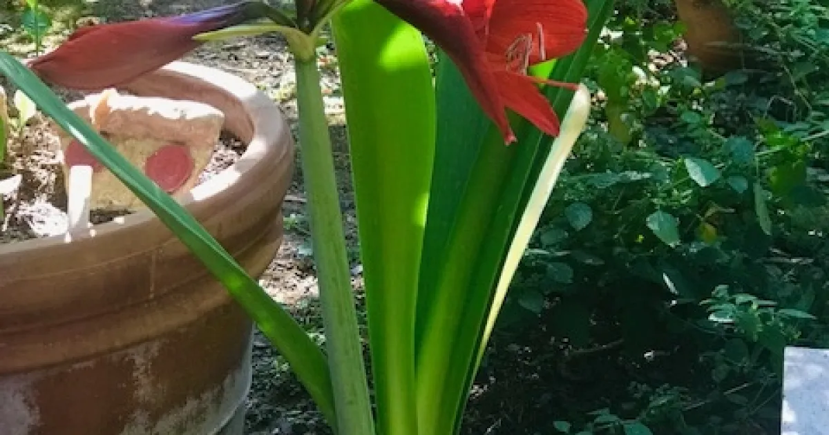 Keep watering the amaryllis—don't let it dry out. Fertilize it once or twice a month. It will produce lots of green leaves. Bring it indoors in September if you want it to flower in December. Continue watering and feeding it.