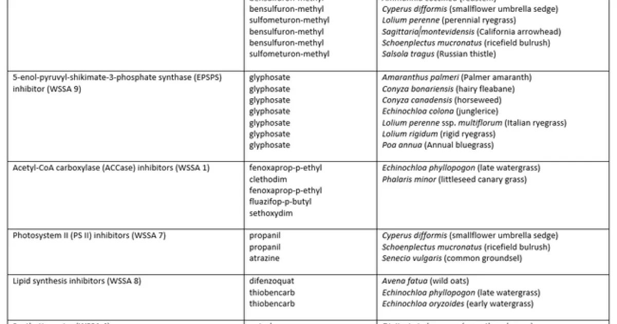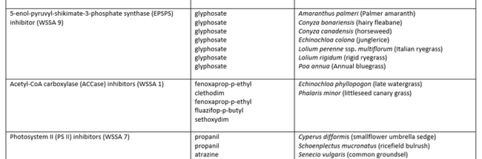 Table 2. Weed species in California with confirmed resistance to multiple herbicide sites of action