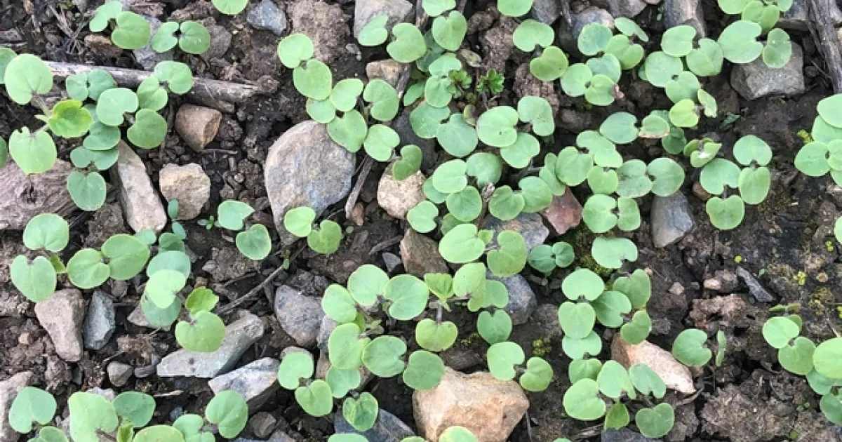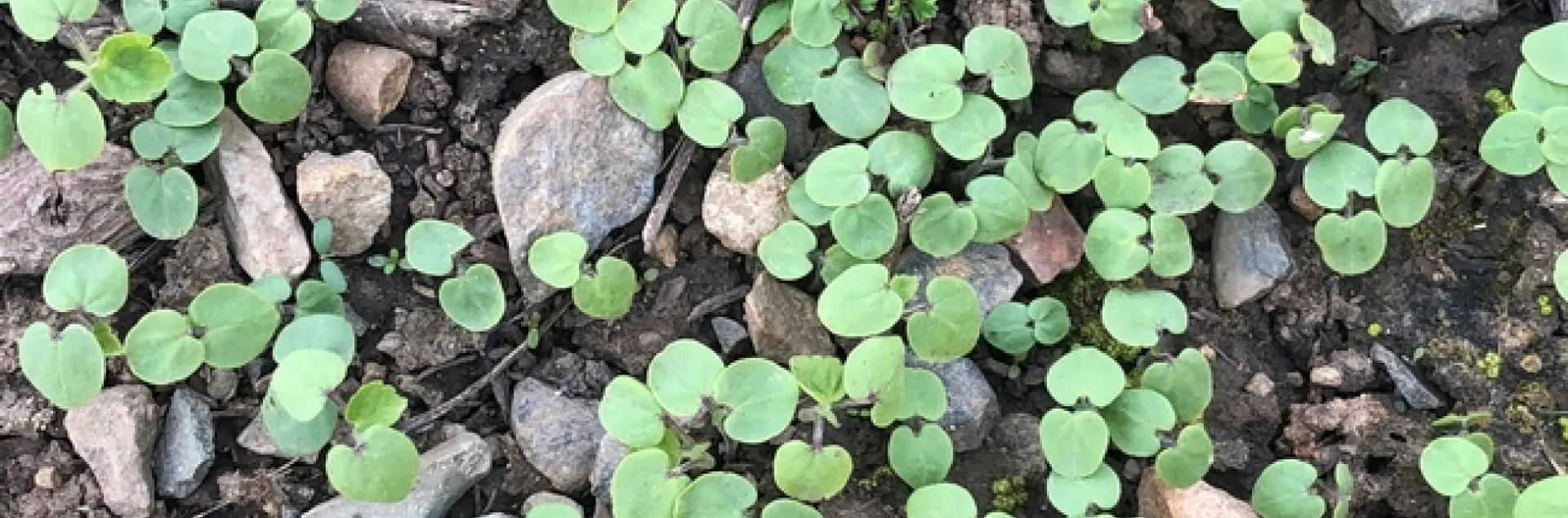 Figure 3. First true leaves of velvetleaf. Cotyledons and leaves are covered with fine, soft hairs. First leaves have rounded teeth and are heart-shaped.