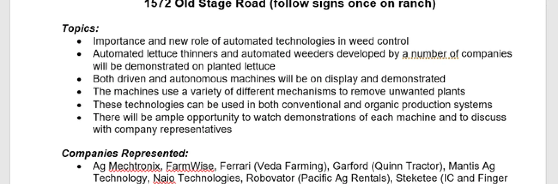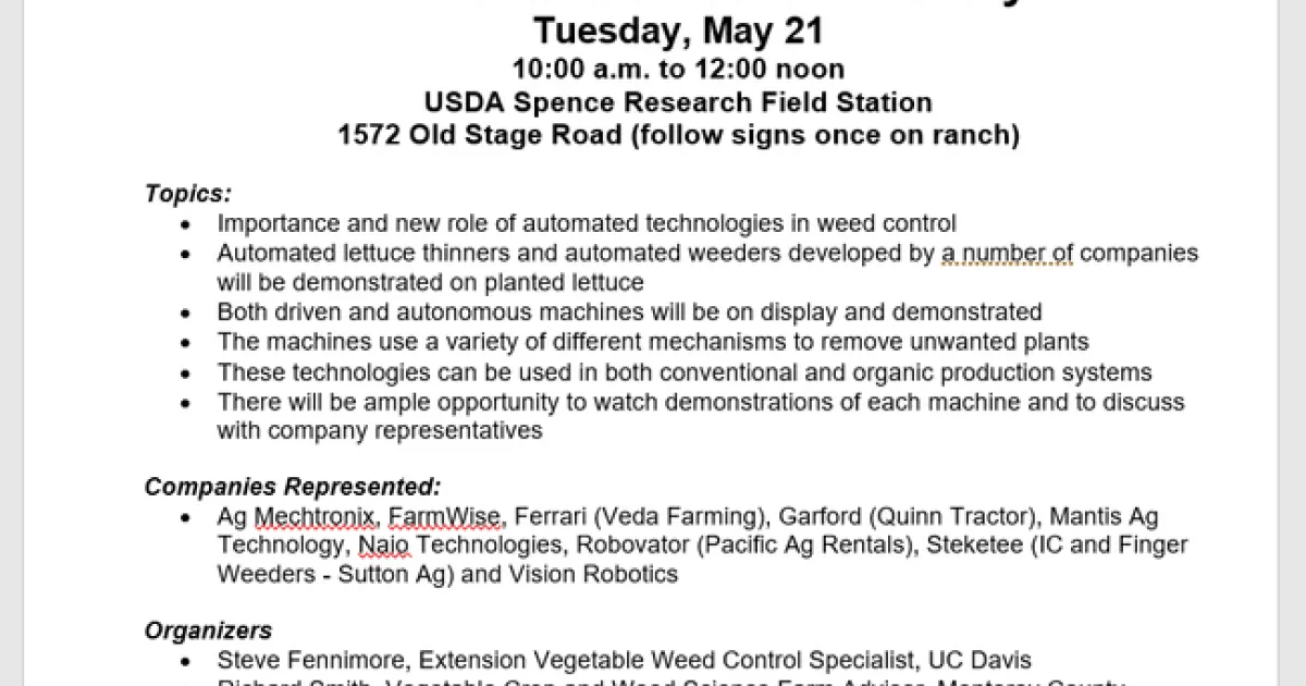 The 2019 Automated Weeder and Thinner Demonstration and Field day will take place on Tuesday, May 21, from 10:00 a.m. to 12:00 noon at the USDA Spence Research Field Station, 1572 Old Stage Road in Salinas. Automated technologies are helping to fill the gap in the supply of labor that is occurring in the farming community. At this field day weeders and automated lettuce thinners developed by a number of companies will be demonstrated on lettuce plantings. Both driven and autonomous machines that use a variety of different mechanisms to remove unwanted plants will be available for viewing. These technologies are useful to both conventional and organic producers. Companies that will be represented include: Ag Mechtronix, FarmWise, Ferrari (Veda Farming), Garford (Quinn Tractor), Mantis Ag Technology, Naio Technologies, Robovator (Pacific Ag Rentals), Steketee (IC and Finger Weeders - Sutton Ag) and Vision Robotics.
