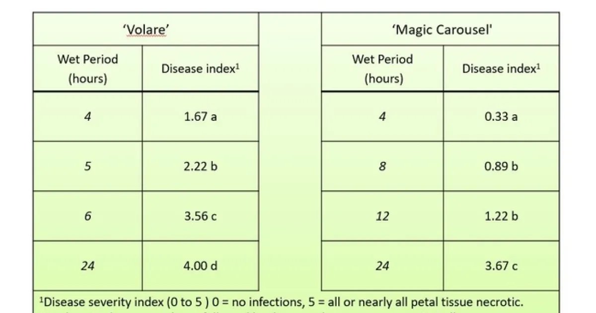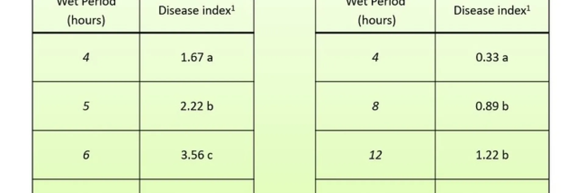 Many diseases will get worse with longer leaf wetness periods. In the table below you can see that the severity of gray mold (Botrytis cinerea) on rose increases with longer wet periods.