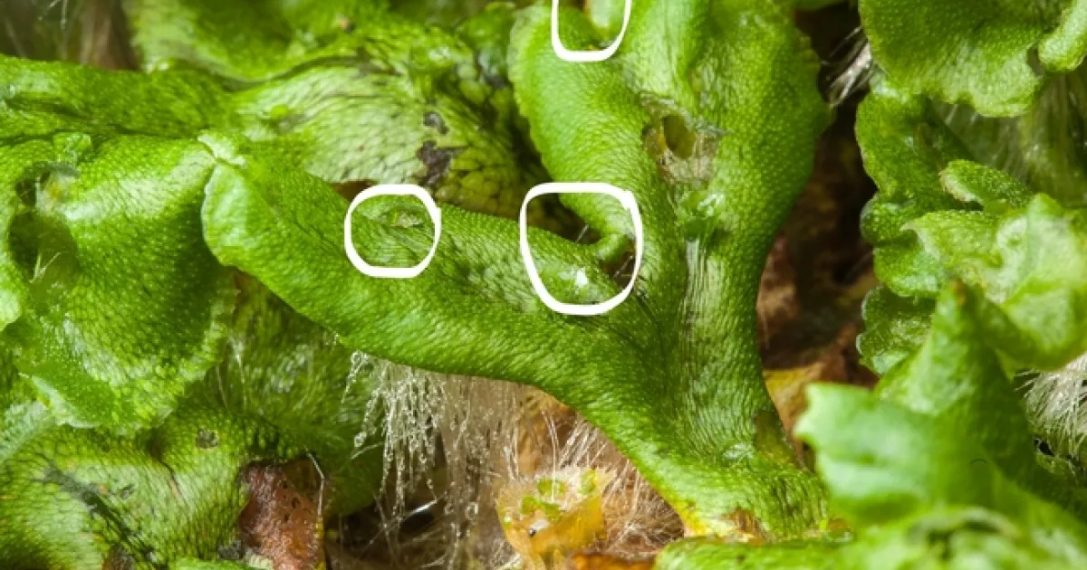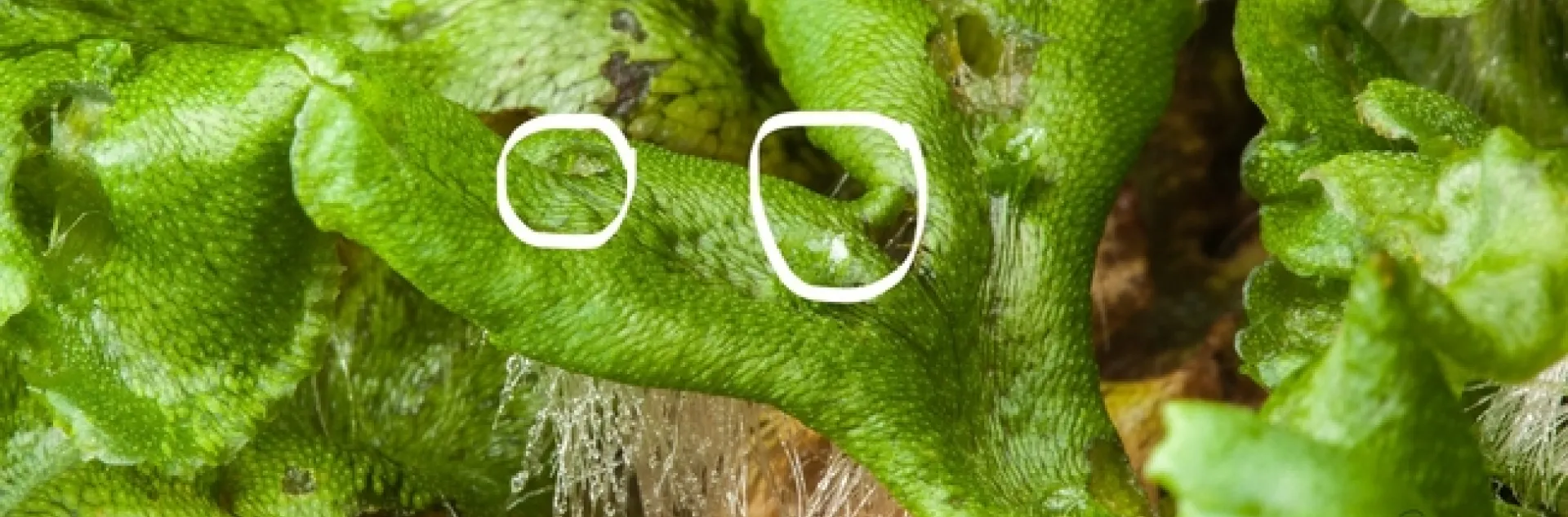 Probably the most important asexual spread in nurseries and greenhouses is a result of gemmae. On the upper surface of the liverwort there are 3 to 4 mm cup-like structures called gemma cups, and at the bottom of each gemma cup over a hundred tiny, disk-shaped gemmae can be produced. When water droplets from rain, sprinkler, or an irrigation wand hits the gemma cups, the gemmae are propelled out and can develop into separate plants. Each gemmae produces a clone of its mother plant.