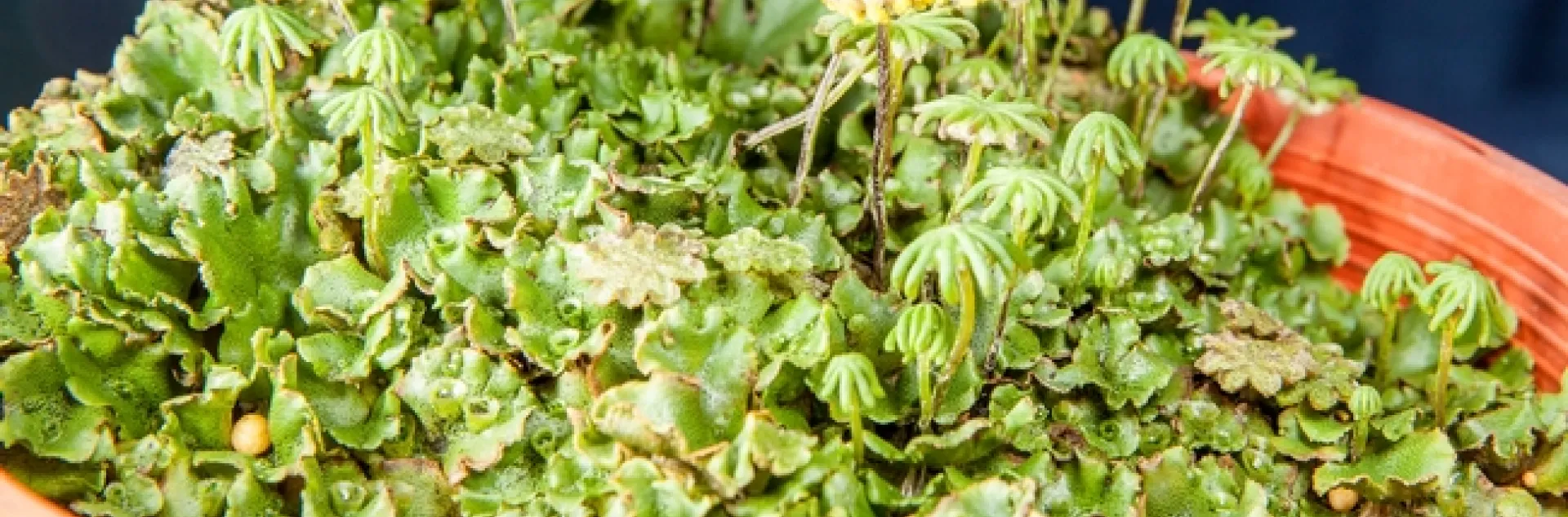 It turns out that liverworts with their haploid nature, production of spores, ease of culture, and quick regeneration time-- the same characteristics that make them weeds--  are the same characteristics that help scientists study the most advanced forms of experimental molecular plant biology. Here is where liverworts shine. In 2015, Japanese molecular plant biologists created liverwort mutants by bombarding them with radiation. These mutants were studied with genetic markers to elucidate how land plants might use their phytochrome system and different wavelengths of light to regulate plant development. In addition, the liverwort's chromosomes have been analyzed. This has revealed that most of the genes that regulate growth and development in higher land plants are also found in liverworts. It has been suggested recently that many of the fundamental features of land plants appeared in bryophytes first and were then co-opted in vascular plants. So in a distant way, the crop plants you grow today have a little bit of liverwort genetic material in them. The next time you cuss out those tenacious liverworts growing in your nursery crops, think about how intrinsically important they are to the crops you grow!