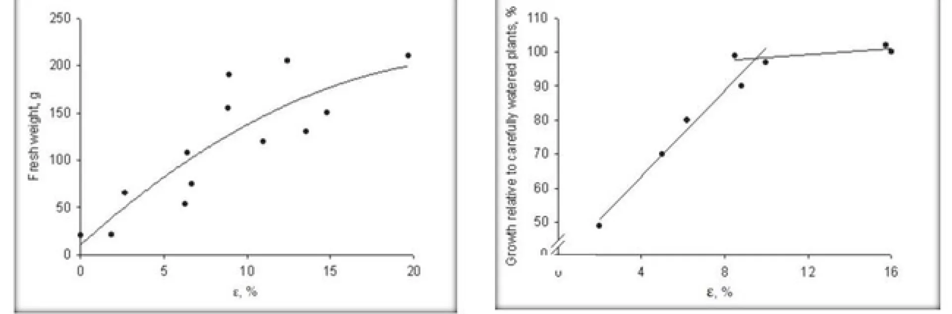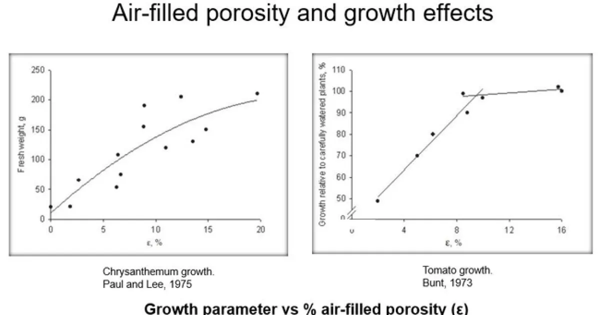 Let's start with air-filled porosity. There have been many experiments demonstrating that air-filled porosity is highly correlated with the growth of various plants. Here are two examples, Fig 1: