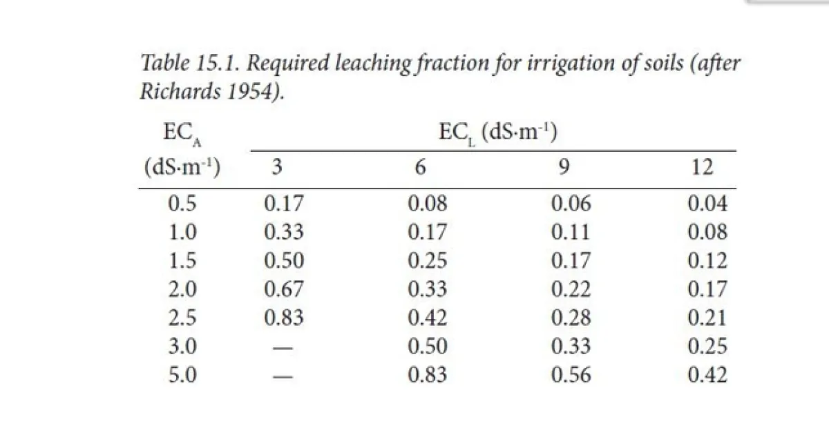 Salt accumulation in the soil is ameliorated by leaching, which is applying enough water so that some water drains from the pot. The leaching fraction can tell us how much extra water to apply. It is the ratio of the volume of water leached (the water that runs out of the bottom of a pot) to the volume of water applied (the total amount of water applied to a pot). The proper leaching fraction depends on the E.C. of the irrigation water applied (E.C.A) and the E.C.- sensitivity of the crop . Most crops tolerate a leachate EC (E.C. L ) of 6 dS/m to 9dS/m while salt sensitive crops tolerate 3 dS/m. So, recommended leaching fractions are given in the table below. In the middle of the ranges, you can see that the leaching fractions are in the 0.2 to 0.25 range, which means, in this case, that about another 20 or 25% water needs to be added to the water applied to the crop. (The exact amount is explained in the handout). Fig 2.