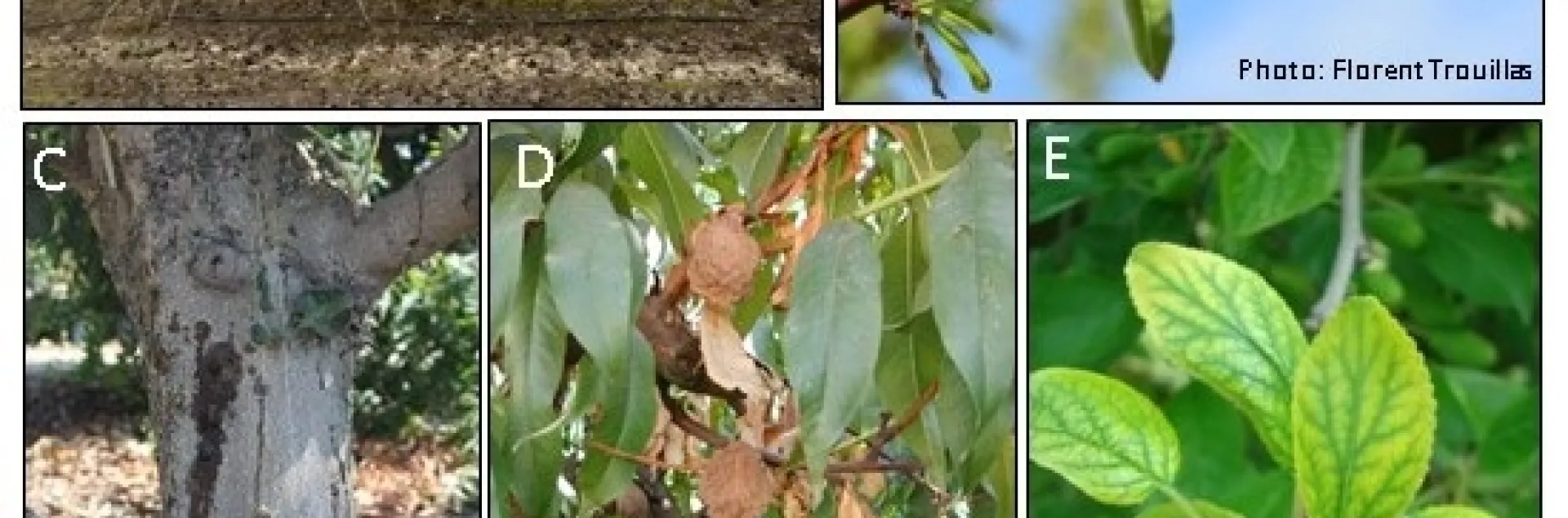 Orchards that have sustained flooding may be physiologically impacted by roots persistence in anoxic conditions and may also be exposed to waterborne plant pathogens. Over time saturated soil will become depleted of oxygen by the roots and microbial communities resulting in anoxic conditions that can lead to root mortality. The extent of damage to the roots may not be realized until the season progresses, and root damage may manifest with general canopy decline and anchorage issues. Many of the tree crops grown in California are grafted onto disease resistant rootstocks. If flood water rises above the graft union, the benefit of these rootstocks is largely negated. Many rootstocks have been selected over time for resistance to Phytophthora spp., a group of soilborne pathogens that create motile spores that swim at the water surface. These pathogens are common in surface water, and incite canker diseases, particularly when the water level persists above the graft union. Symptoms of infection include general canopy decline and cankers, many of which ooze or ‘bleed' (Figure 1C). The full suite of symptoms may not manifest until further into the growing season when the heat imposes stress on the trees.