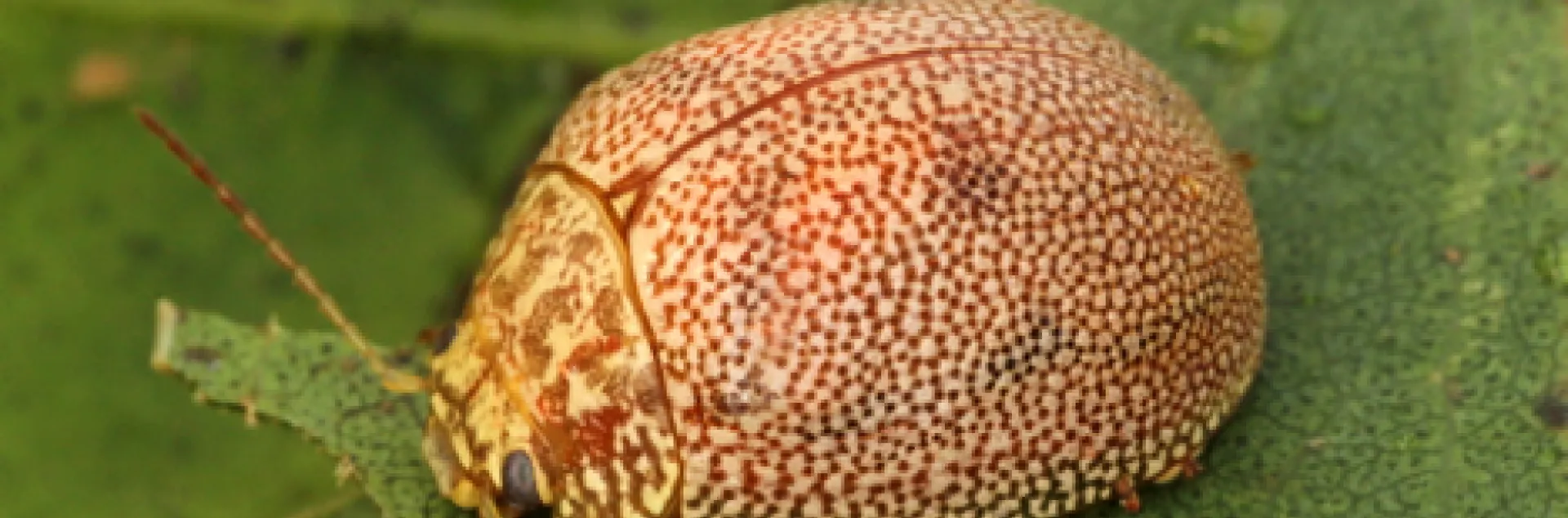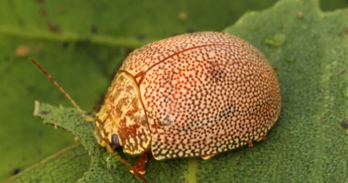 Adult beetles are about 3/8 of an inch with oval bodies and little beady black eyes (Figure 1). They are tan in color and covered in orangish dots. There are darker spots along the top and edges of the wings. The antennae are straight and become slightly darker toward the tip.